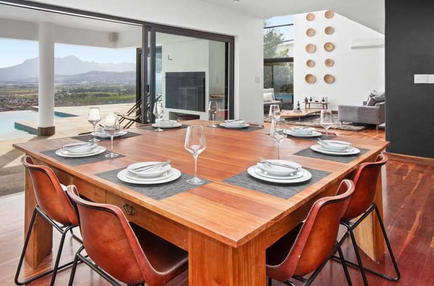 Enjoy the general features, such as secure parking, a private outdoor pool, sea and mountain views, and modern amenities like WiFi, Netflix, and a tumble dryer. The family-friendly environment includes a lounge area with a flat-screen TV and air conditioning, a dining room with balcony access, and a fully equipped kitchen with appliances like a fridge, coffee machine, microwave, dishwasher, oven, washing machine and steam tumble dryer. On-site facilities include a braai area with a strict no-smoking indoors and no-pets policy.