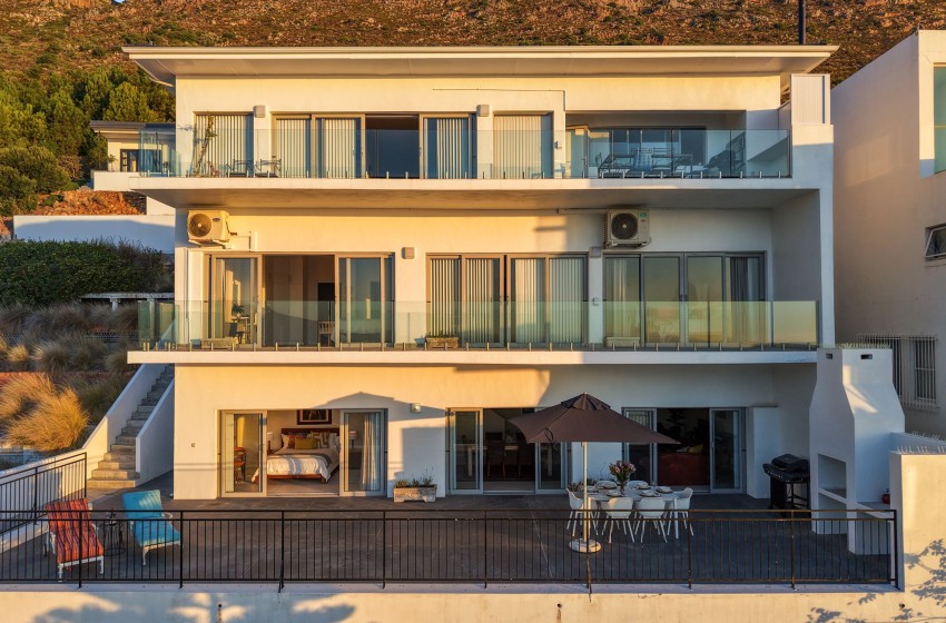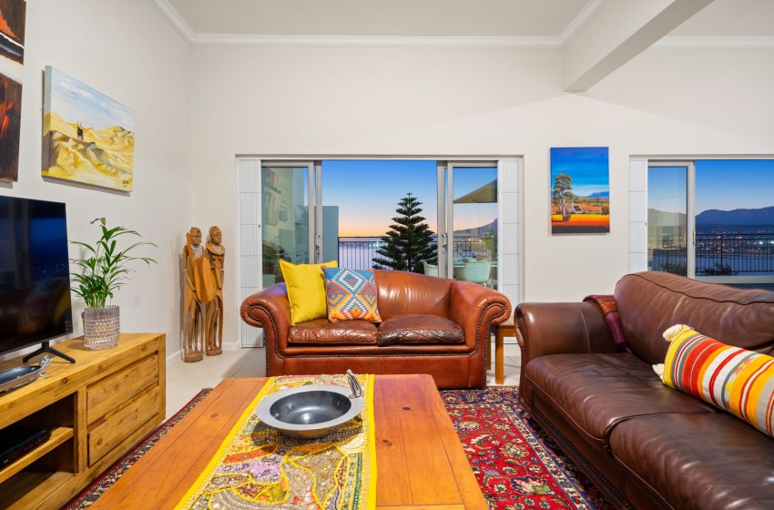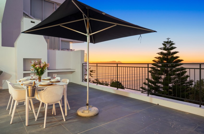 A glass sliding door leads to a spacious balcony that offers stunning views of the ocean and mountains. The balcony is equipped with an outdoor braai (barbecue), comfortable loungers, and a dining set that seats up to six people, making it the perfect place to relax and enjoy the beautiful scenery.