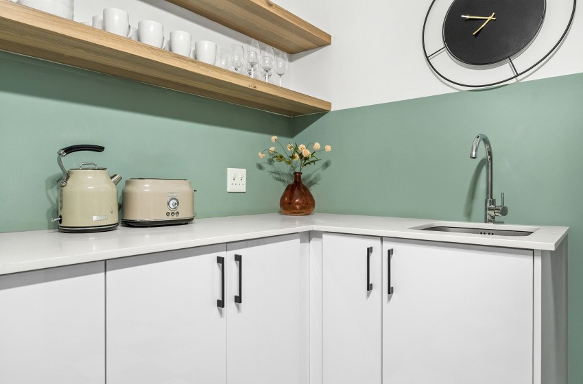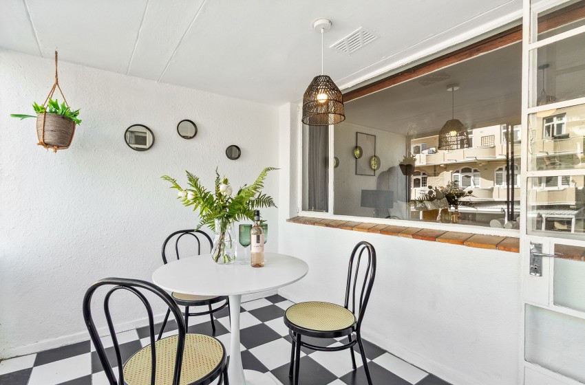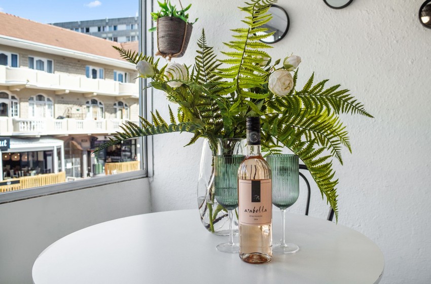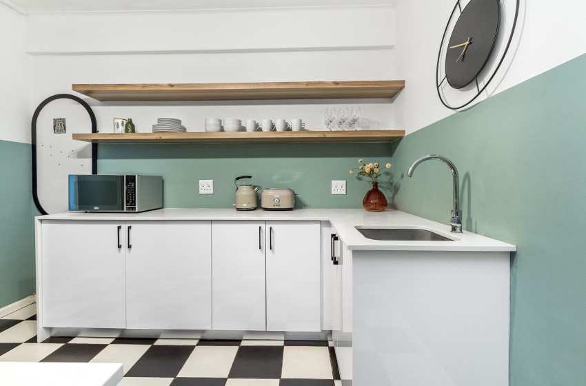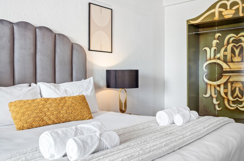 As you enter the apartment, you will be greeted by a modern kitchen with a clean, minimalistic design with a unique touch of retro charm. The kitchen is fully equipped with everything you’ll need to enjoy a comfortable self-catering experience. Additionally, the property features a stylish dining nook, giving it a cosy yet modern feel, furnished with a simple dining table paired with woven rattan chairs. The lounge is thoughtfully furnished with a spacious, comfy sofa, two rattan armchairs, a stylish glass coffee table, and a TV cabinet housing a flatscreen television, creating the perfect spot for entertaining.