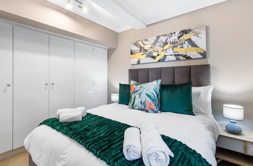 Step inside to discover a chic and comfortable living space adorned with modern decor and stylish furniture, creating a warm and inviting atmosphere. The apartment boasts two bedrooms, perfect for accommodating up to four guests. The master bedroom features a luxurious queen bed and an ensuite bathroom with a rejuvenating bath and shower, while the second bedroom offers another queen bed and easy access to the shared bathroom.