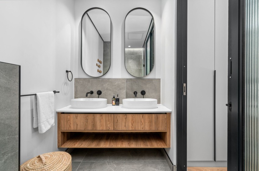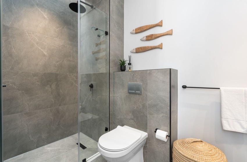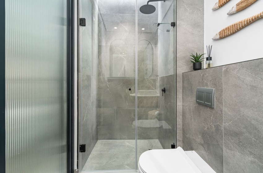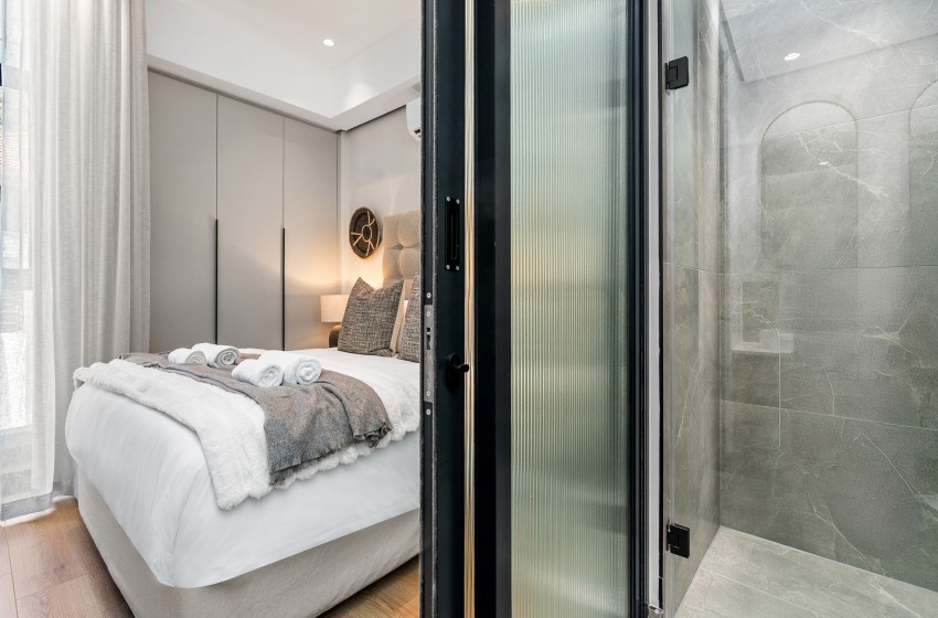 The bedroom is thoughtfully furnished with a queen-size bed with nightstands on either side, with an en-suite bathroom featuring a walk-in shower, a toilet, and a double sink with vanities. Linen and towels are provided with your stay.
