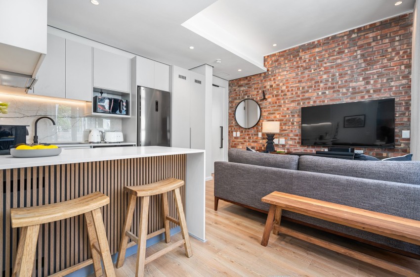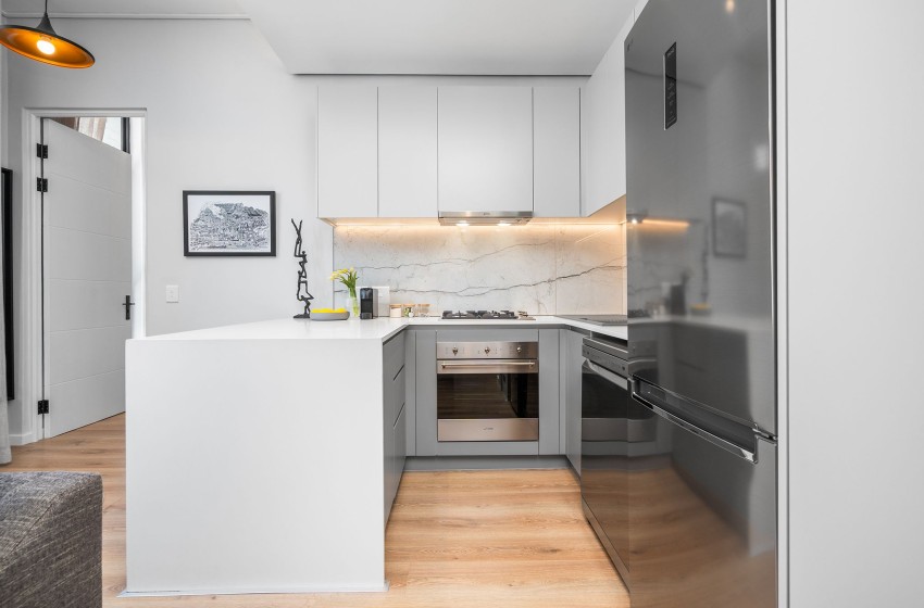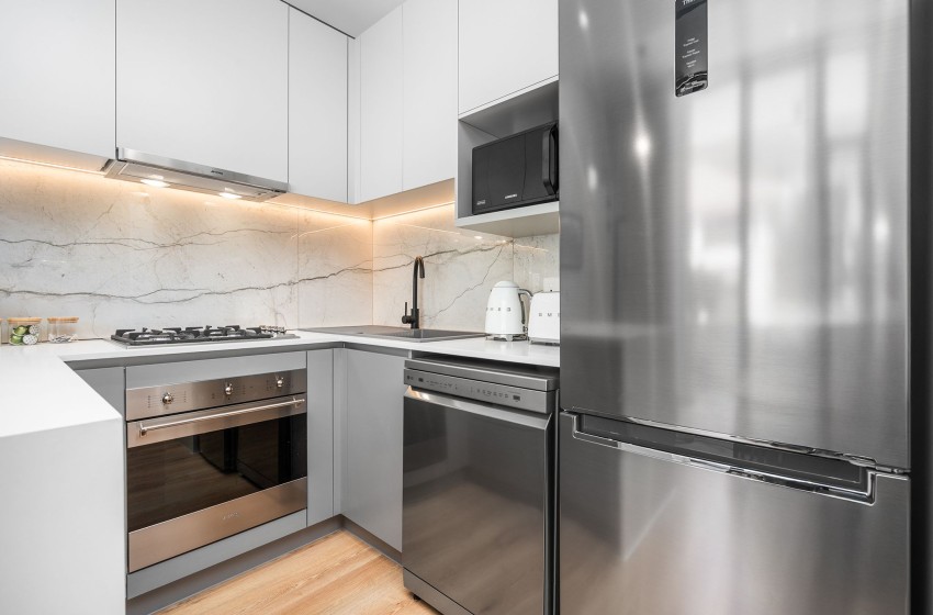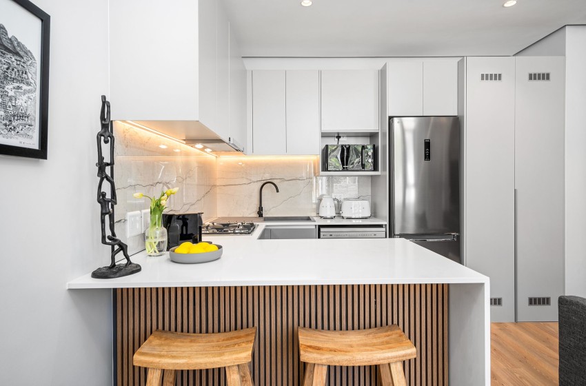 As you enter the apartment, you will be greeted by the open-plan design of the space, flooded with an abundance of natural light streaming in from the large windows. The kitchen is fully equipped with everything you need to enjoy a comfortable self-catering experience with a Nespresso coffee machine for added convenience and a breakfast bar extending from one wall, serving as both a workspace and a dining area with stools for two.