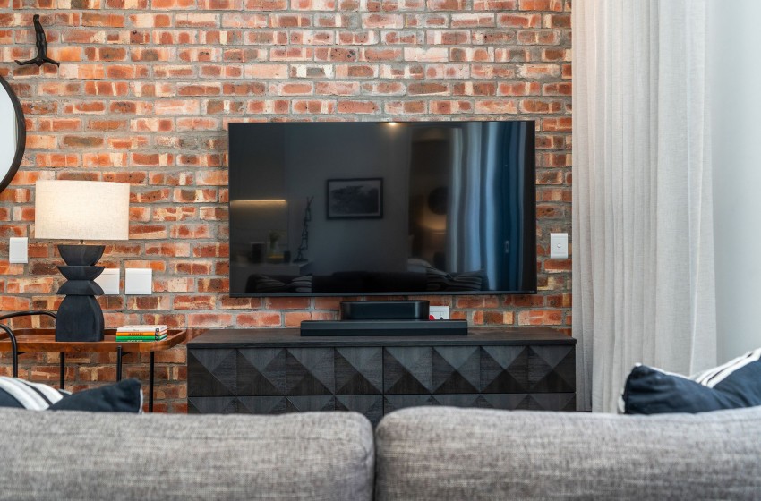 The modern living room features a spacious couch with a coffee table, a geometric-patterned media console with a wall-mounted television and internet access is available throughout the property. Sliding doors open to the patio, featuring two comfy armchairs and a round side table, creating the perfect spot to enjoy a peaceful afternoon, taking in the scenery with a drink of your choice.