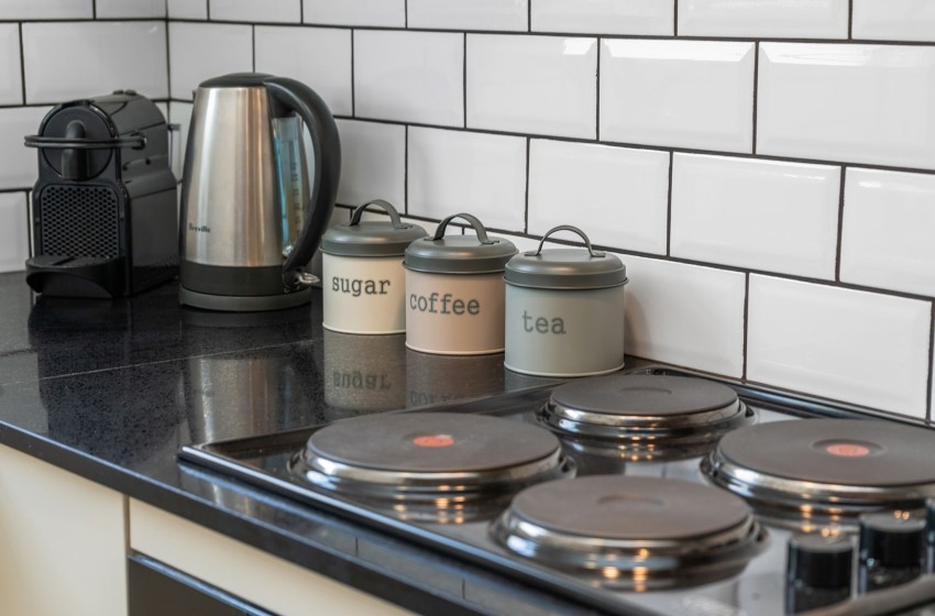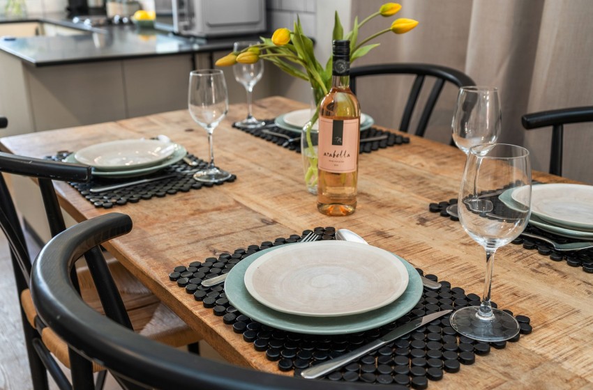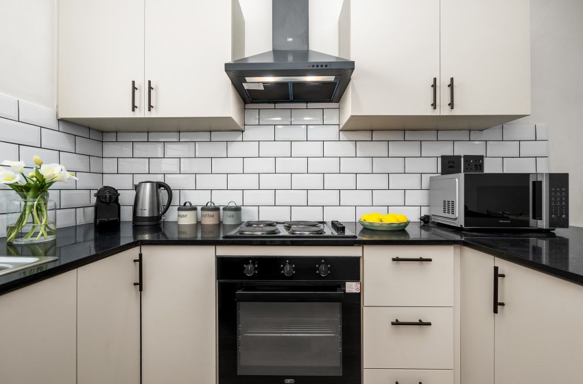 Upon entering the ground floor apartment, you'll be welcomed by the inviting open-plan living space, enhanced by frosted windows that border one wall, maintaining privacy while allowing in subtle natural light. The kitchen is fully equipped with everything you need to enjoy a comfortable self-catering stay with ample storage and counter space, and a coffee machine for added convenience.