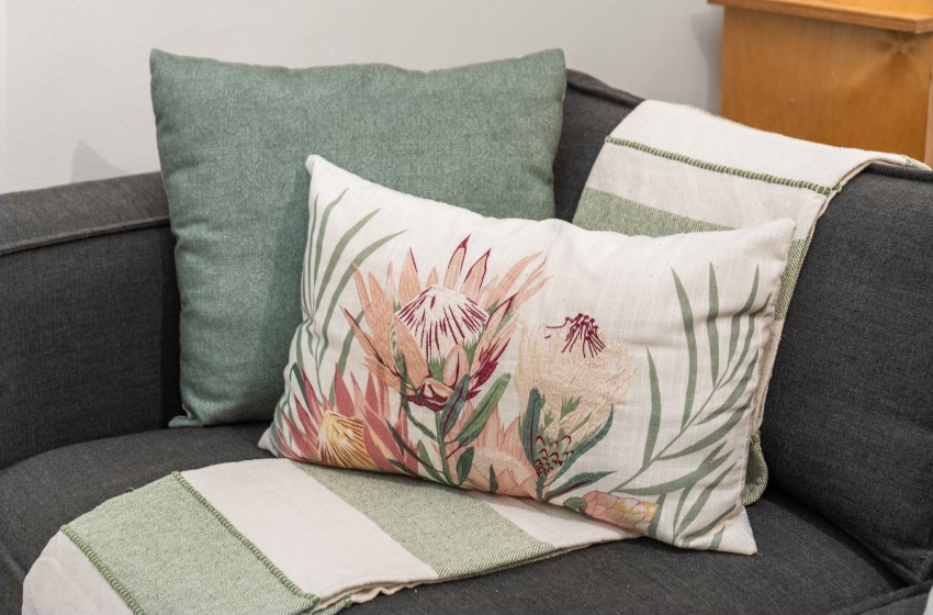Across from the kitchen, the dining space features a rustic, wooden dining table with seating for four. The lounge is thoughtfully furnished with a cosy couch, a spacious pouffe, and a TV cabinet housing a flatscreen television for your entertainment, with access to streaming channels such as Netflix.
