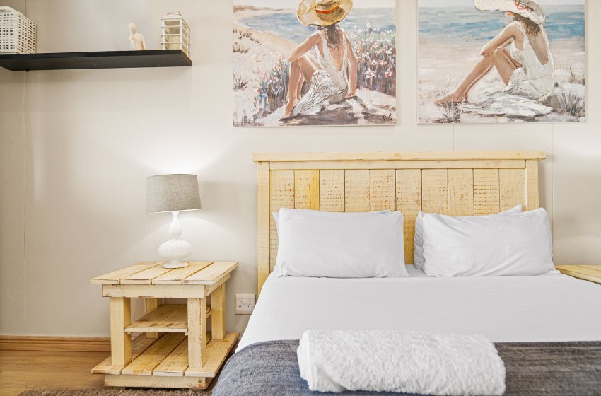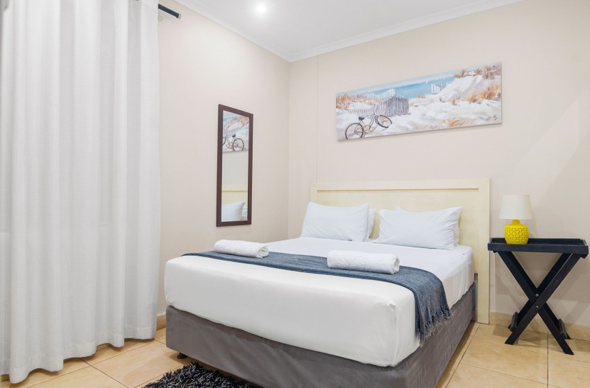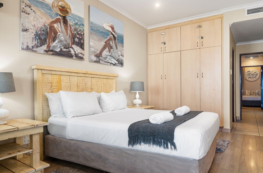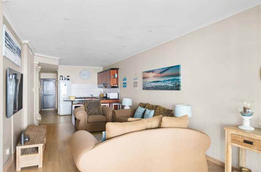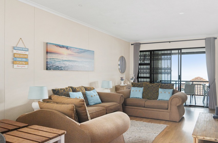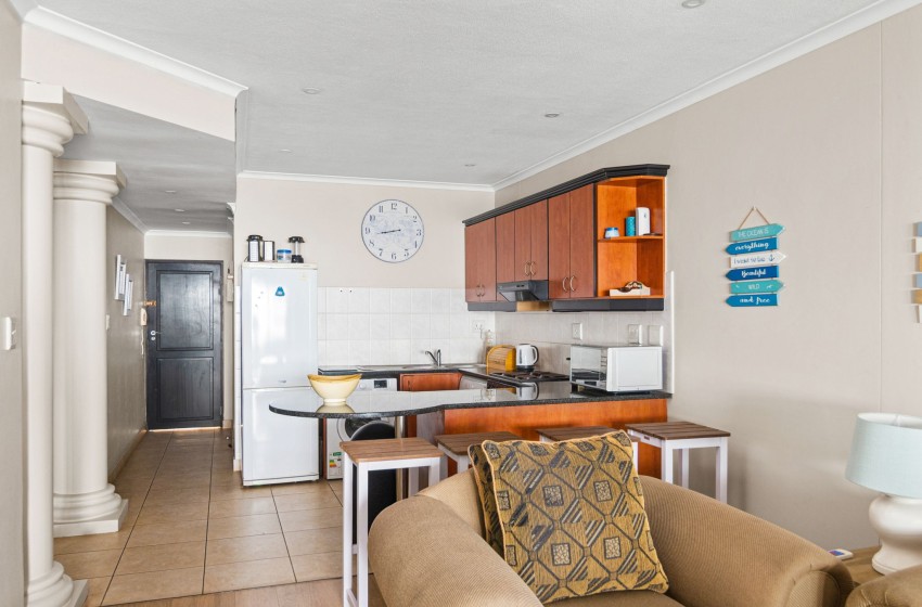 The kitchen is fully fitted with everything you need to enjoy a relaxing self-catering experience. The lounge features an open-plan design, creating a spacious and inviting atmosphere. The space is thoughtfully furnished with plush couches and a TV cabinet with a mounted flat-screen television for your entertainment, as well as WiFi throughout the property. Large sliding doors open to the balcony overlooking the swimming pool and ocean, the perfect spot to unwind.