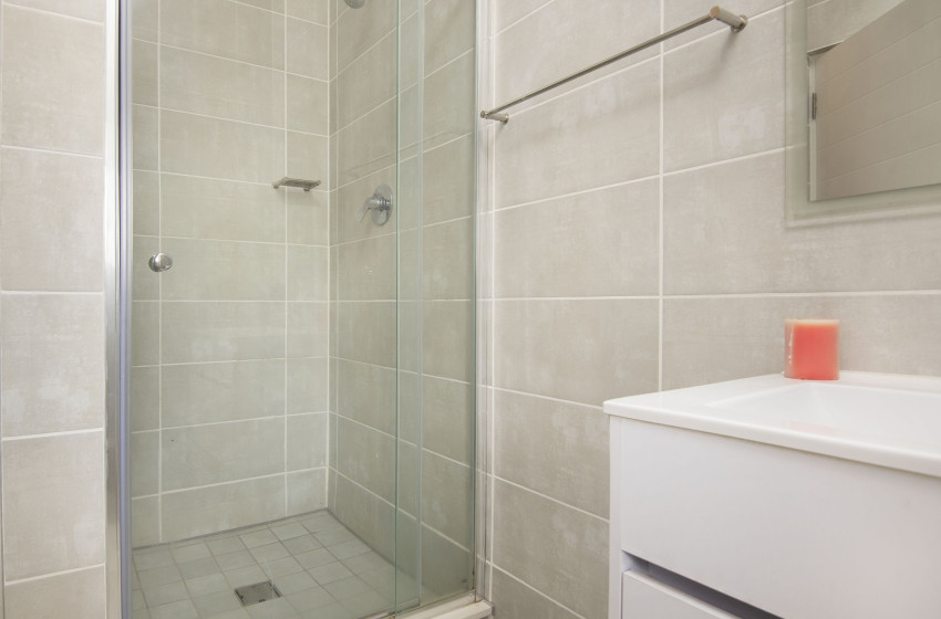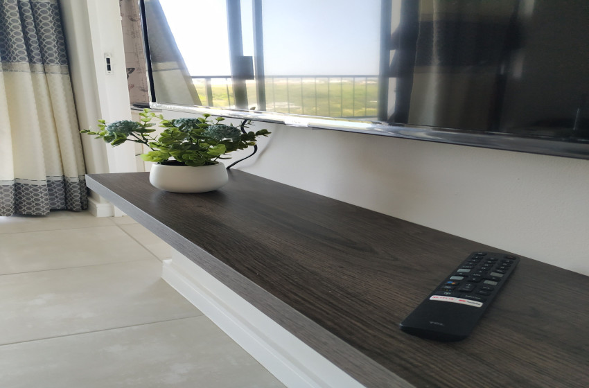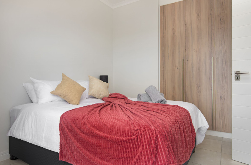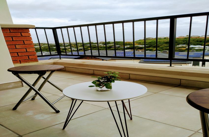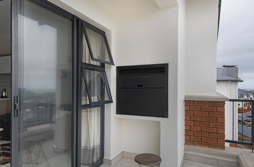 The main living area is open-plan and consists of a stylish lounge with a large flat-screen TV and a kitchen fully equipped with every appliance needed for a comfortable self-catering stay, including a dishwasher and washing machine. The living area leads to a furnished balcony with a built-in braai, making it the ideal place to relax or entertain with a glass of wine. The bedroom is decorated with warm and inviting features, a decently sized queen bed, built-in cupboards, and boasts a glass sliding door for balcony access and ample natural light during the day and amazing starlit views at night. The single bathroom is beautifully maintained and features a shower.