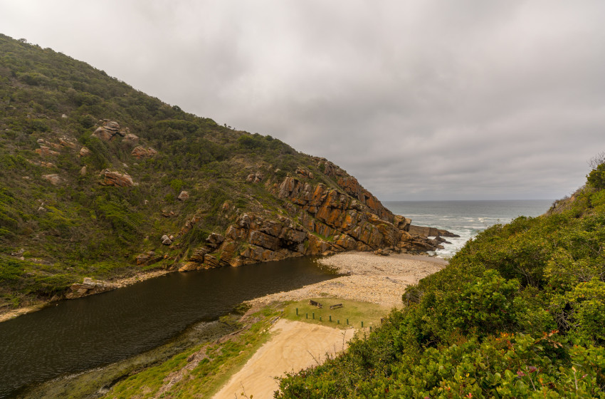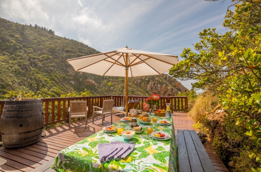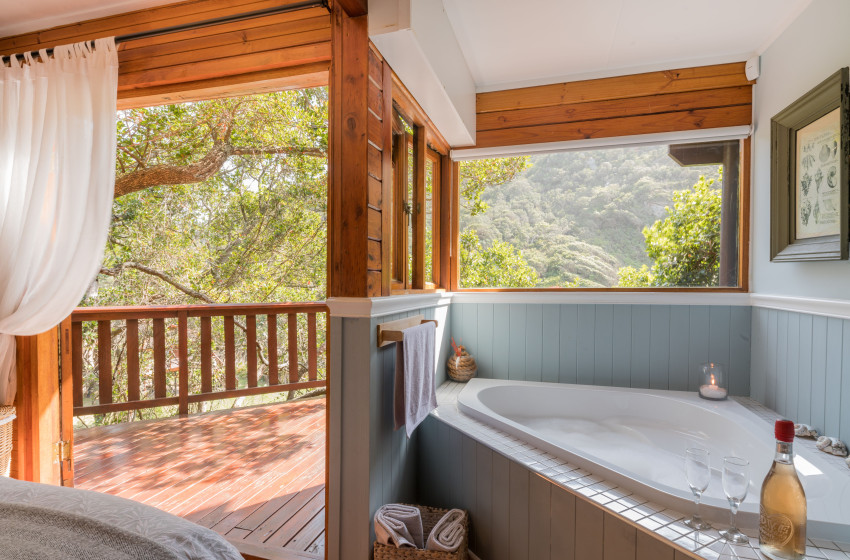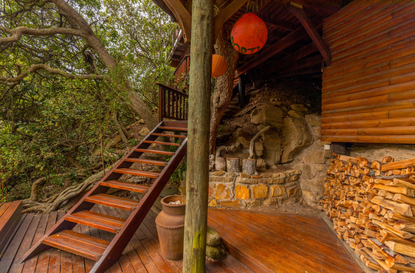 It's hard to imagine a more natural and serene setting than this self-catering gem, which sleeps up to 4 adults and 2 children. Ballots Bay is situated in a private nature reserve, home to a wide range of animals, birds, indigenous forests, and fynbos. After reaching the top of a 67-step wooden stairway leading up to the Ballots Treehouse, you will find three cosy, tastefully decorated bedrooms on the lower level. The main bedroom boasts a queen size bed, an en-suite bathroom, and a lavish corner bathtub. The second bedroom has a double bed, and the third bedroom is a small room with bunk beds, ideal for two children. Upstairs is a third bathroom, dining area, and fully-equipped kitchen, and an open-plan lounge that spills out onto a generous deck. Watch NetFlix movies while lounging on the comfortable leather couch in front of the fireplace on a winter's evening. Dine on the upper deck shaded by a large parasol, or relax over sunset cocktails and prepare a braai in the Weber while soaking up the uninterrupted views over the beach and river mouth.