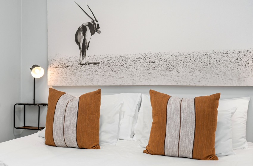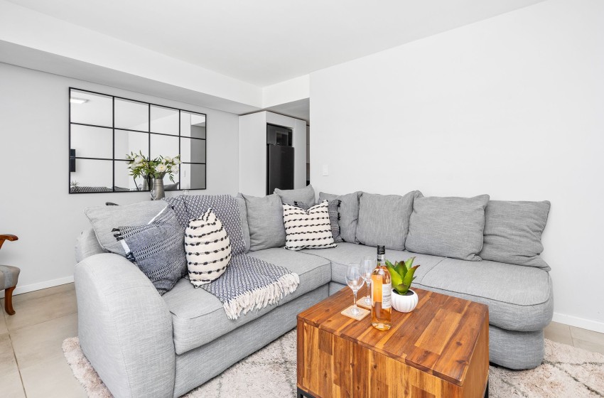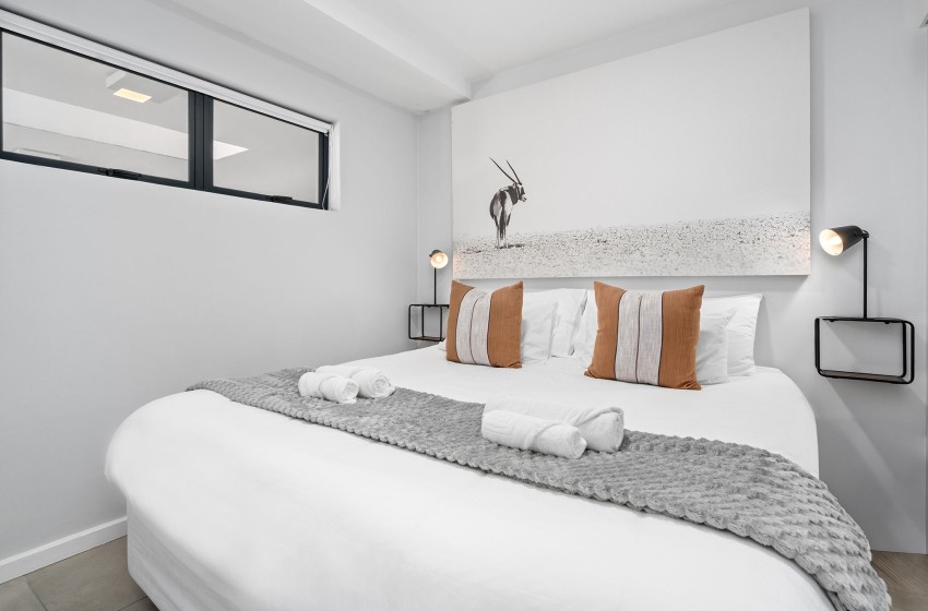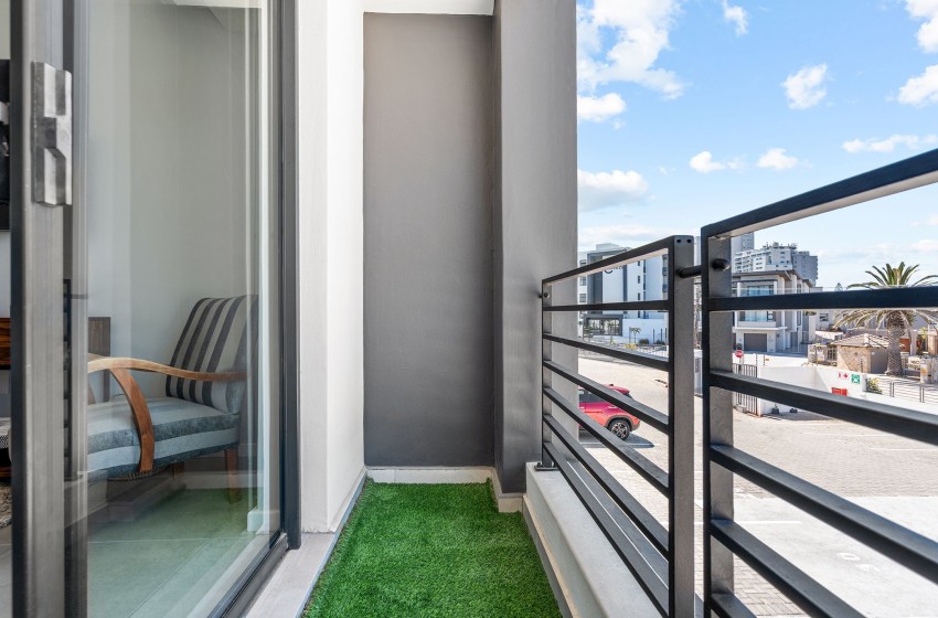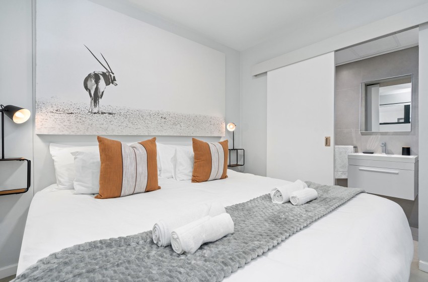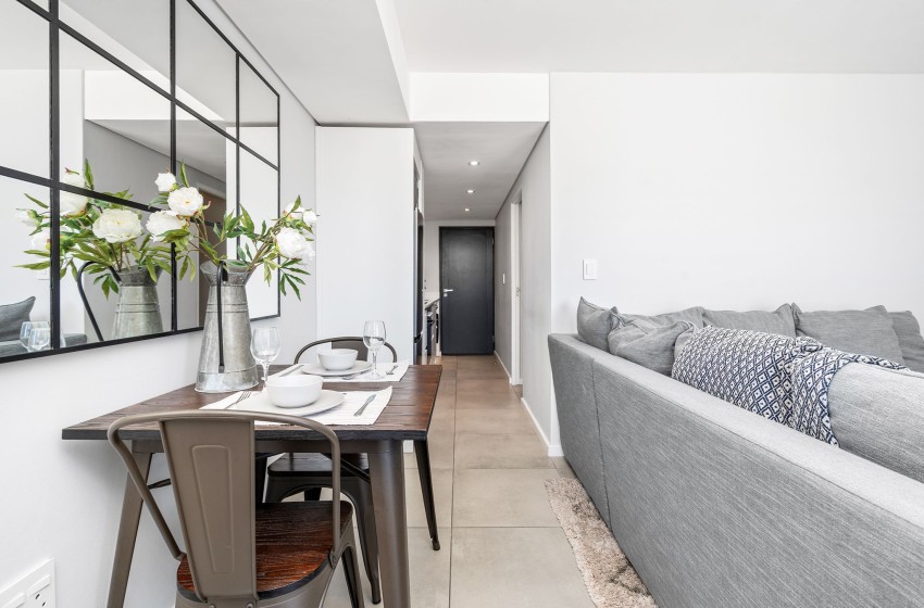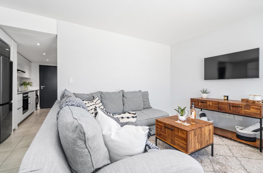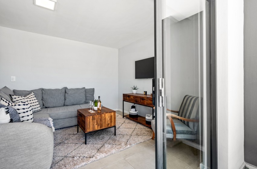 From the kitchen, you will find yourself in a dining area with seating for two guests, ideal for morning breakfast, as well as a modernly furnished lounge with a comfortable couch, chairs, cabinet, and a mounted flatscreen television, creating the perfect spot for entertainment and unwinding. The glass doors fill the lounge with an abundance of natural light and lead to the balcony where you can enjoy the fresh air after a busy day of exploring and sightseeing.