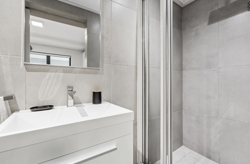 The property features one bedroom that is fitted with a comfy double bed and wall-mounted bedside tables with lamps. Additionally, this room has a sliding door that takes you to a bathroom with a toilet, mirror, vanity with washbasin, and rain shower. Linen and towels are included with your stay.