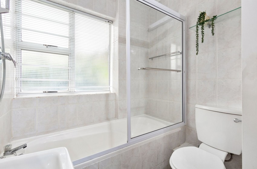 The main bedroom contains a double bed, while there are two single beds in the second bedroom. The well-appointed bathroom features a shower-bath combo, a washbasin with vanity, and a toilet.