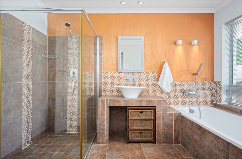 The two bedrooms are homely and tastefully decorated, with glass sliding doors providing access to the patio. The main bedroom features a queen-size bed with a mounted flatscreen television and offers an en-suite bathroom, while the other room is fitted with a double bed and guests will make use of a shared bathroom. Both bathrooms are equipped with a large shower, toilet, and washbasin with vanity while only one features a bathtub. All linen and towels are included in your stay.