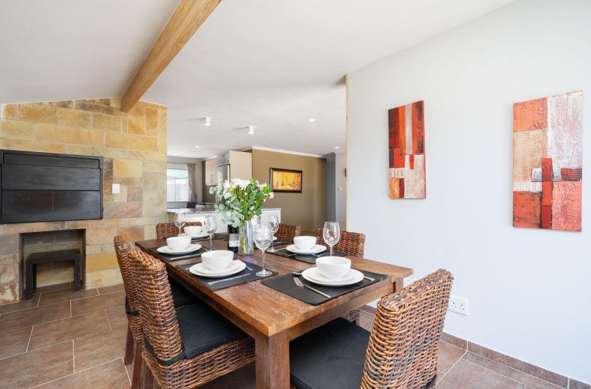 The lounge is fitted with plush couches adorned with accent pillows, a flatscreen television, internet access, and air-conditioning. A built-in braai is located near the dining room where guests can relax and enjoy a traditional South African barbeque experience. The dining room features a large hardwood dining table with 6 seats and a glass sliding door leading to the patio where guests are welcome to relax on the sun-kissed patio with comfortable seating making this the perfect spot for sipping sundowners, enjoying meals or simply soaking up the sun.