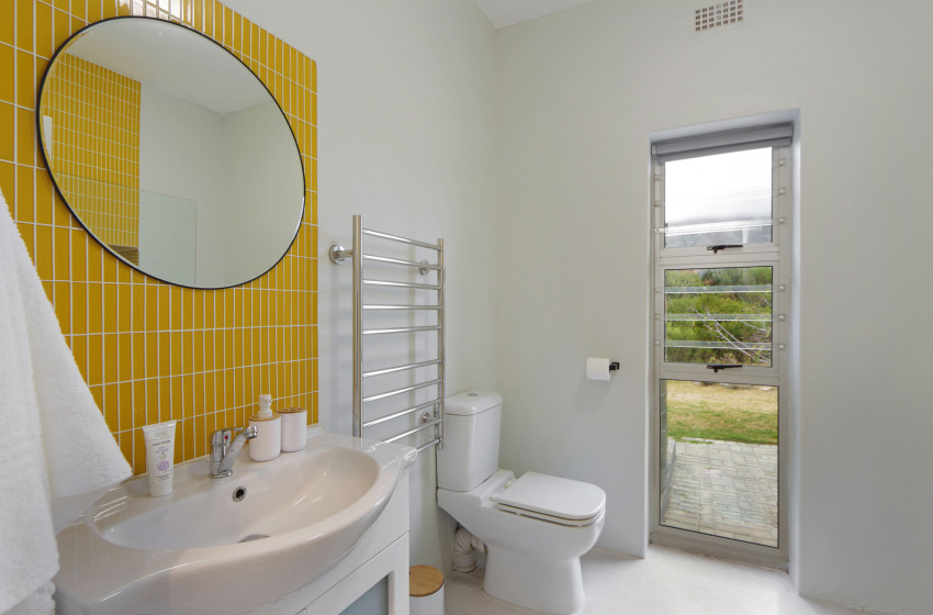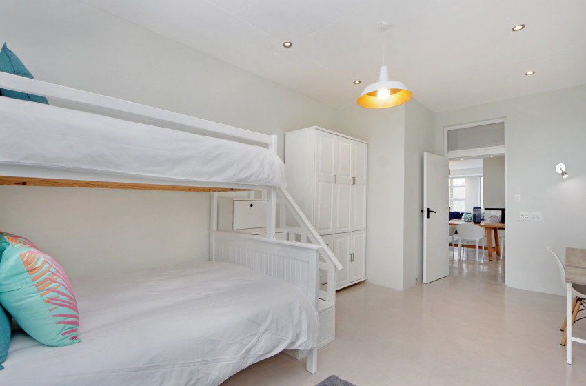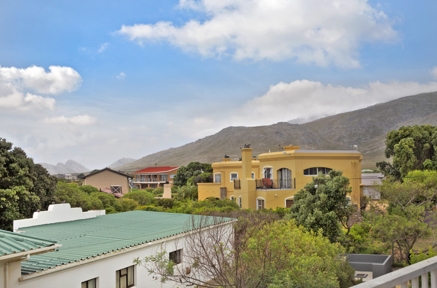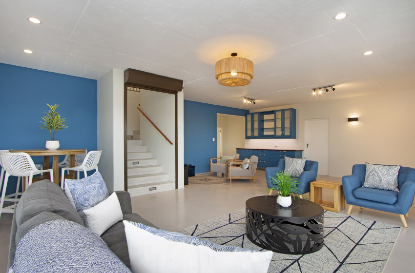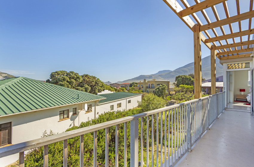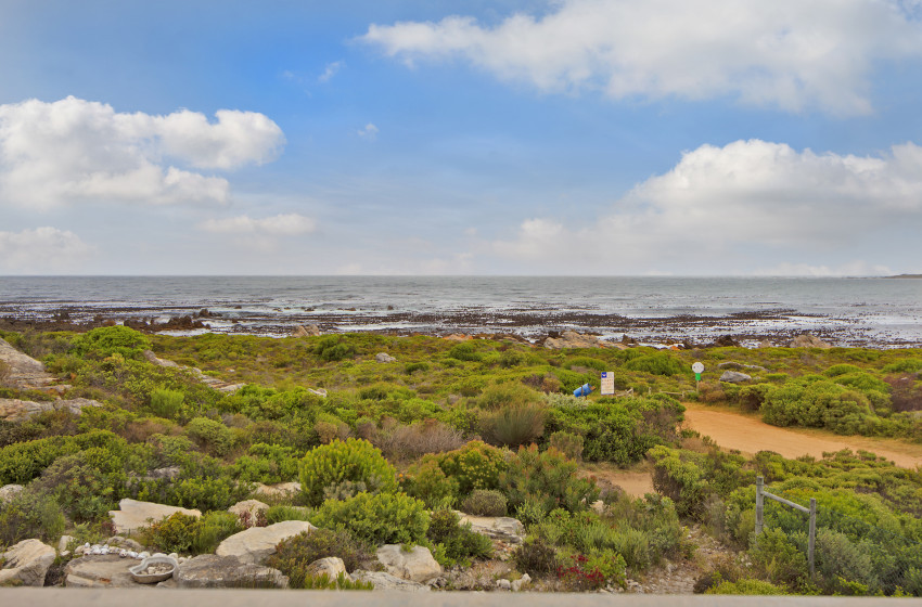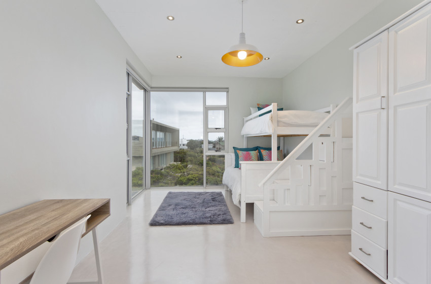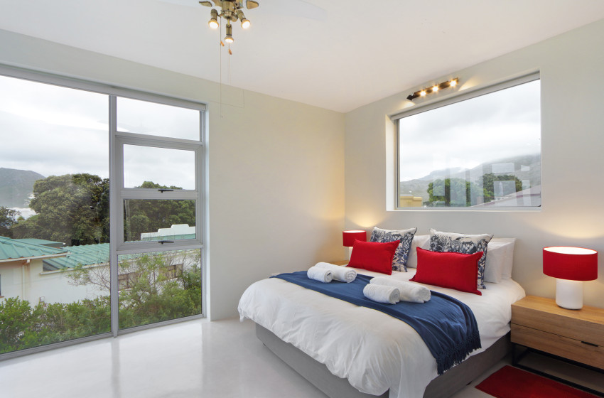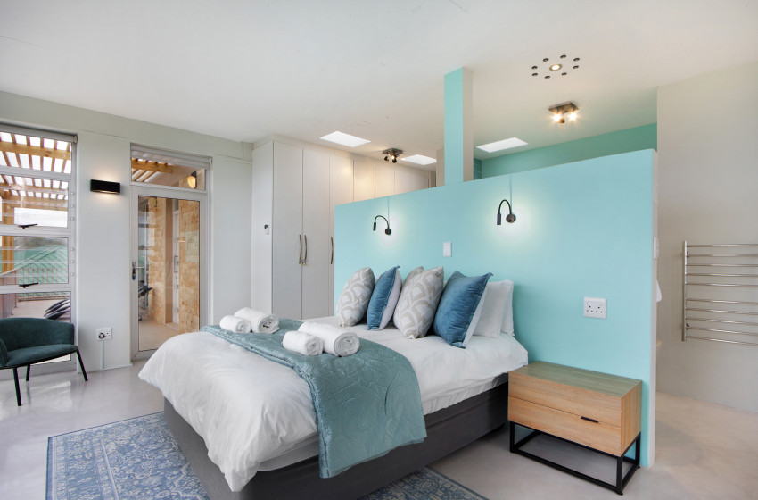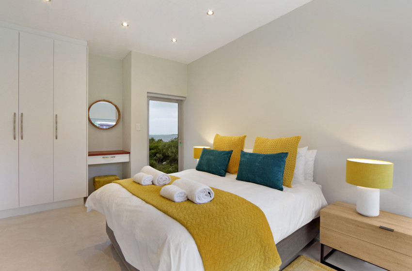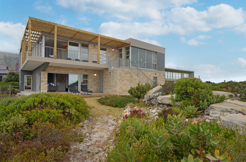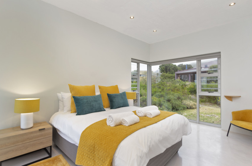 The interior is designed to complement the natural surroundings, with each space individually designed to perfection with colour, space and modern finishes. The house has an inverter, and backup battery, for its two levels with five bedrooms, providing ample space for family or friends to enjoy. The lounge and kitchen on the top floor open into a stylish open-plan space leading to a neat and refreshing balcony with stunning sea views. Upstairs, the main bedroom is open plan with an en-suite bathroom straight out of a luxury home magazine. A further two bedrooms upstairs are artfully laid out to give a sense of tranquillity and connection to nature through an abundance of light and sea or mountain views. The two downstairs bedrooms are also beautifully furnished and open into an open plan living area and balcony with sea views and an indigenous fynbos garden.