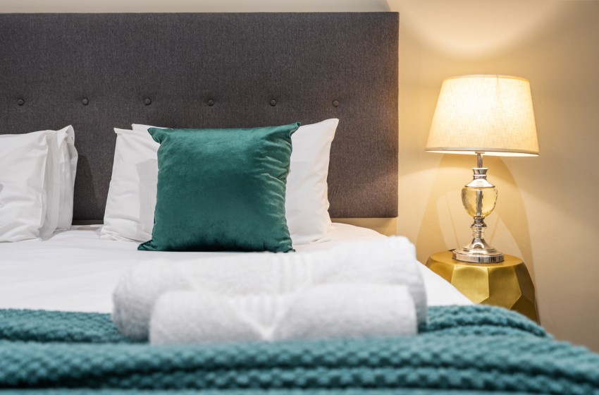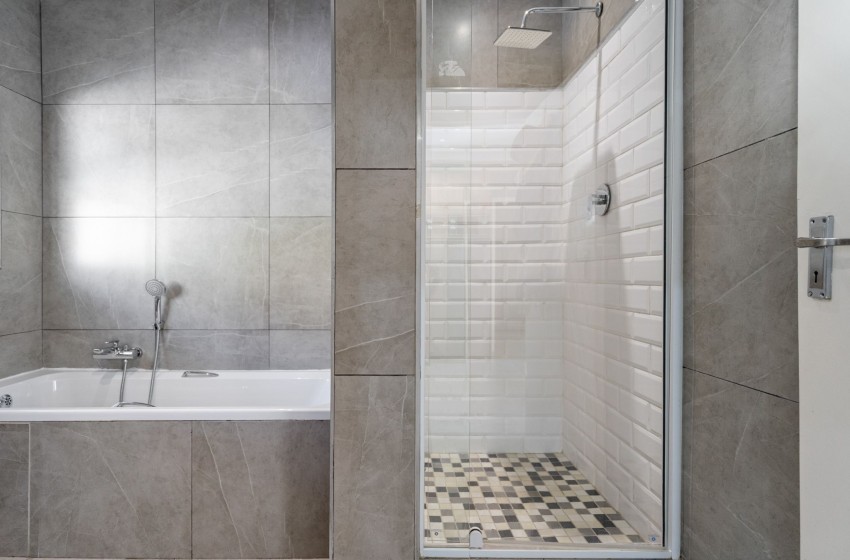 The main bedroom is thoughtfully furnished with elegant nightstands on both sides of the king-sized bed featuring sliding doors providing access to the balcony, while the second bedroom is fitted with a comfy double bed. The bedrooms make use of a shared bathroom equipped with a spacious walk-in shower, bathtub, toilet, and washbasin with vanity. Linens and towels are provided with your stay.