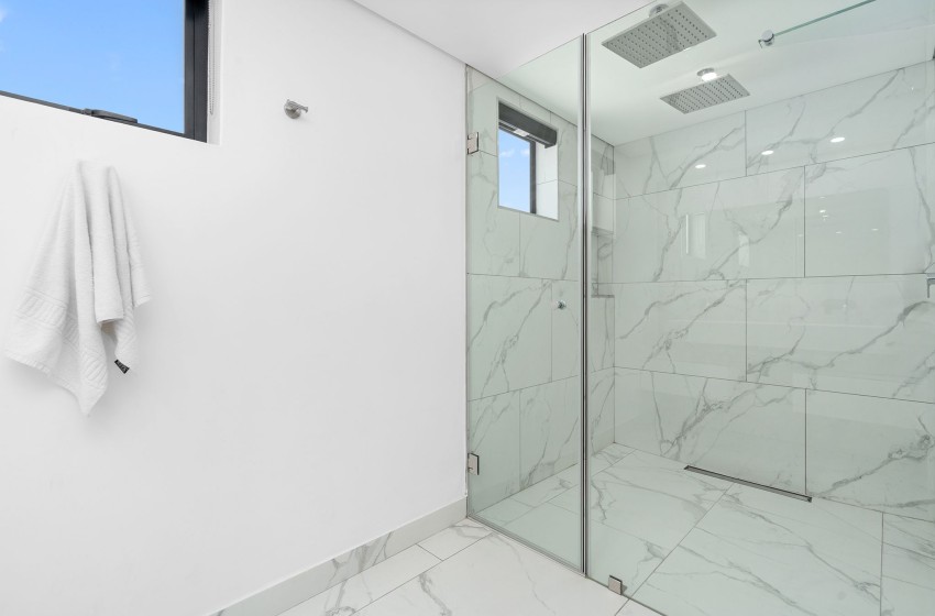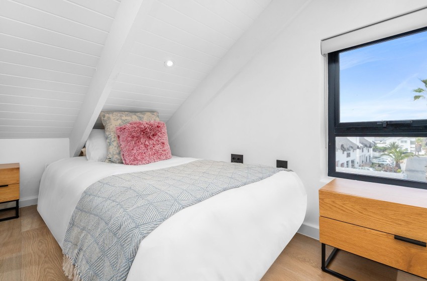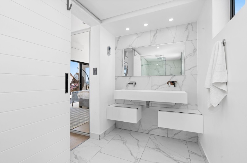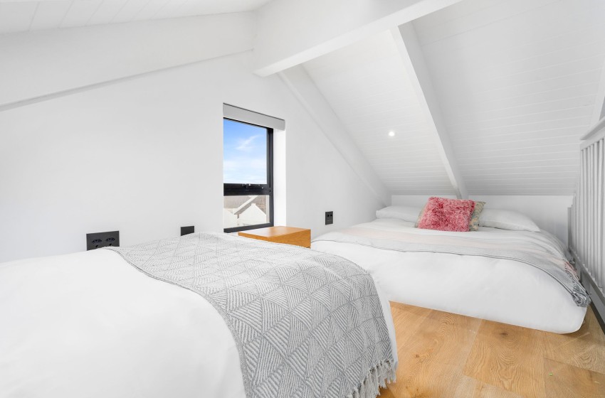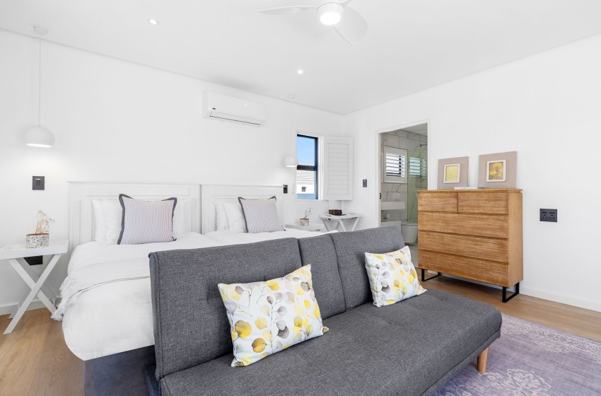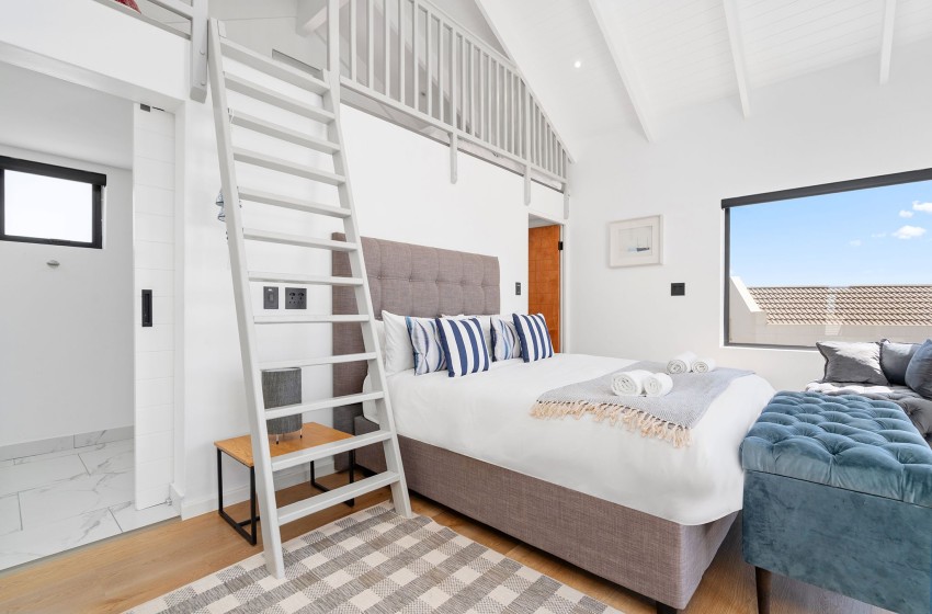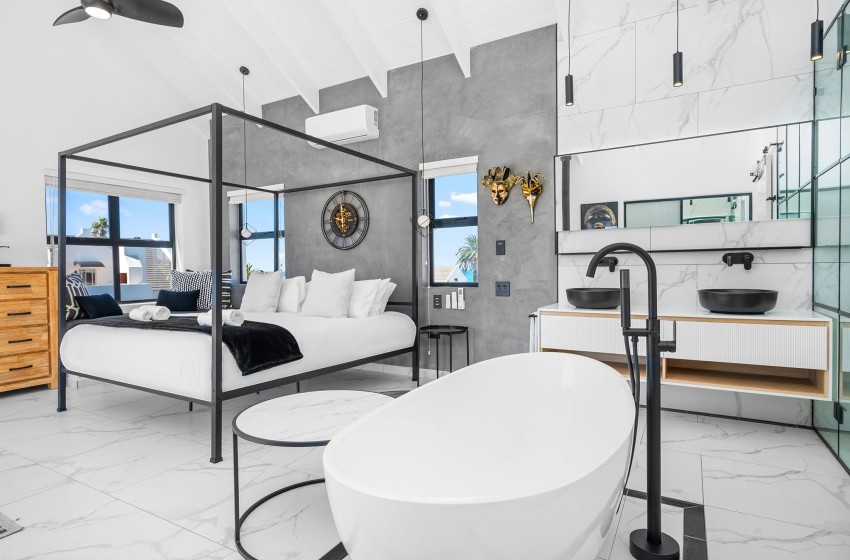 One of the four beautiful ensuite bedrooms is located downstairs, with two ¾ beds and has direct access to the private garden and outdoor patio through sliding doors. All four bedrooms have spectacular sea views, air conditioning, ceiling fans and private outdoor patio access. A stunningly designed staircase guides guests to the second floor, which houses the remaining three ensuite bedrooms. The master bedroom boasts a king-size bed, an indoor fireplace and a seamless open-plan design with a free-standing bath, double basin and double “his and hers” shower, all integrated within the bedroom but with a private ensuite toilet. The remaining two bedrooms each feature a queen-size bed. One of these rooms also includes a loft-style space, accessible via a sturdy ladder within the bedroom. This cozy elevated hideaway offers an additional queen and ¾ bed. With its low ceiling, it’s an ideal space for children, offering a whimsical and playful semi-private retreat just for them.