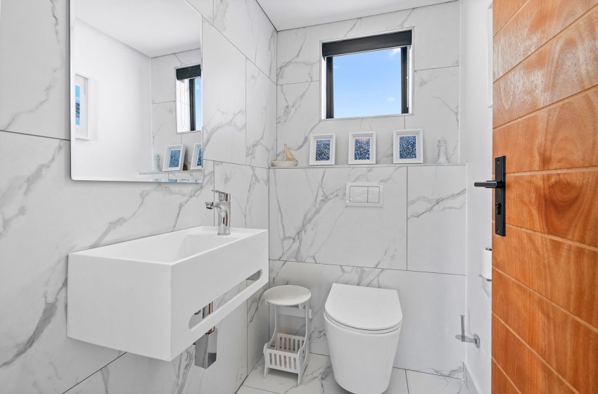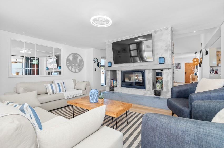 An inviting double sided, wood-burning fireplace separates the dining room from the tranquil lounge area, fitted with a smart TV, creating the ideal place to relax and unwind. Adjacent to the lounge is an enclosed patio or entertainment area with stackable seamless glass doors ,allowing an abundance of fresh air and natural light to fill the room. This area has an indoor wood barbeque/braai, making this the perfect spot to enjoy social gatherings, board games, sudoku or puzzles. There are also multiple cosy reading nooks with beautiful sea views throughout this home which offer the perfect space to unwind with a book. For added convenience, there is a guest toilet within the living space.