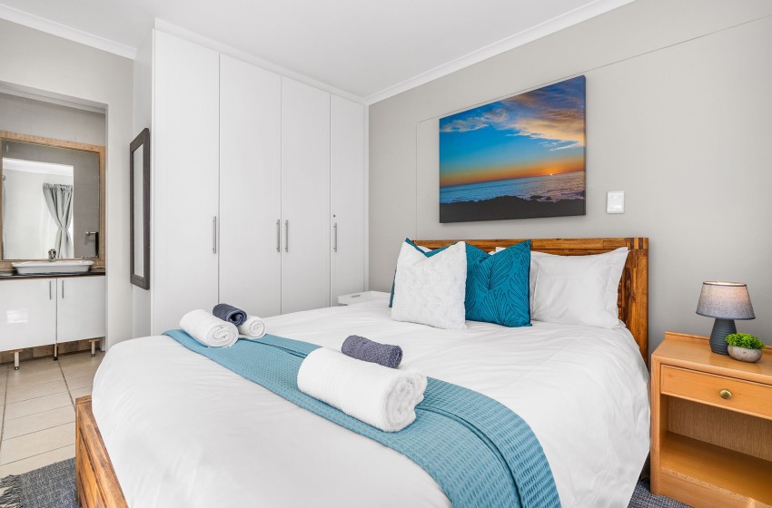 This is a thoughtfully designed two-bedroom, two-bathroom staycation that features a comfortable lounge and a balcony with a braai area for those perfect, relaxed evenings overlooking the trees and a soft sea view. Wi-Fi is available throughout the apartment.
