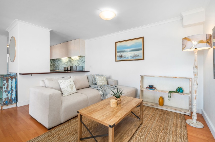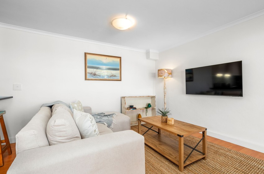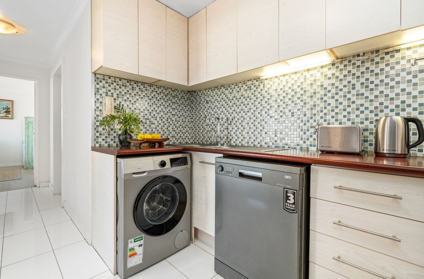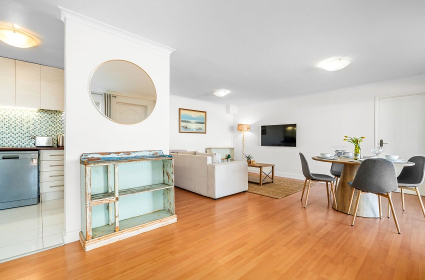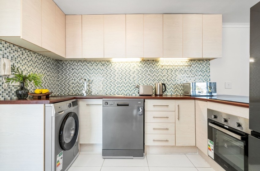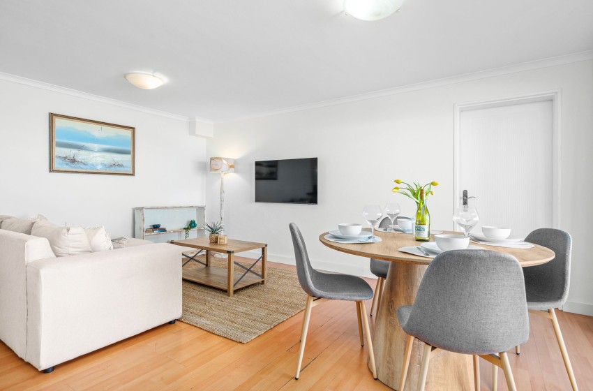The living space invites guests to enjoy the lounge area with plush seating and a flat screen TV, where you can kick up your feet and enjoy your favourite TV shows. Alongside the lounge is an intimate dining space seating four guests comfortably where all your favourite meals may be enjoyed. The fully equipped kitchen includes all your culinary necessities as well as a dishwasher and washing machine for your convenience.