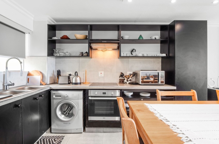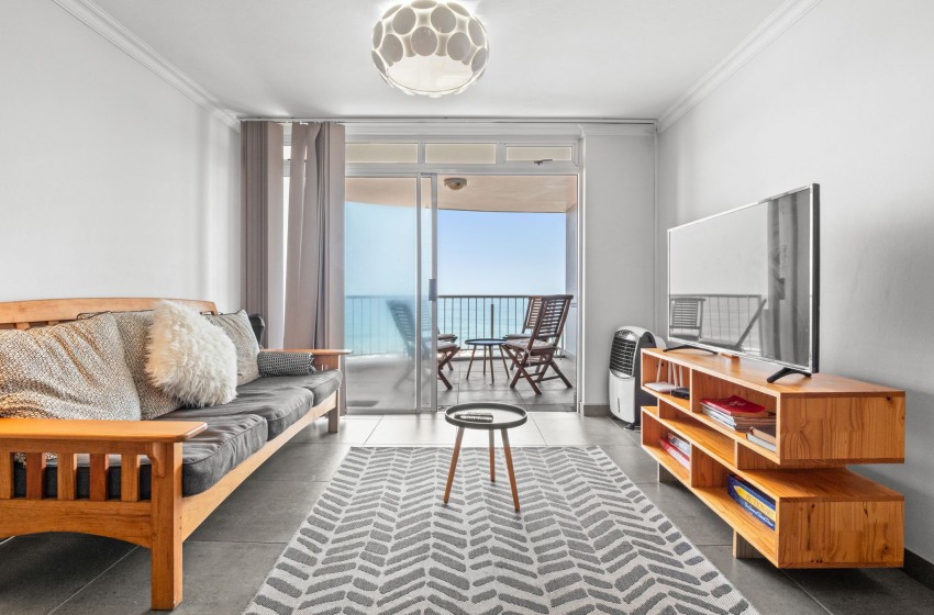 The apartment’s open-plan design creates a seamless flow of space, guiding your eyes to the gorgeous balcony with majestic ocean views. The fully equipped kitchen features all the essentials needed to whip up your favorite dishes, including a washing machine for added convenience. A 6-seater dining table is perfect for enjoying meals or quality time together. Relax in the cozy lounge area with TV, or just unwind while taking in the views from the comfortable couch. The best feature of the apartment is the balcony, which boasts outdoor furniture, ideal for hours of relaxation while you take in the spectacular surroundings.