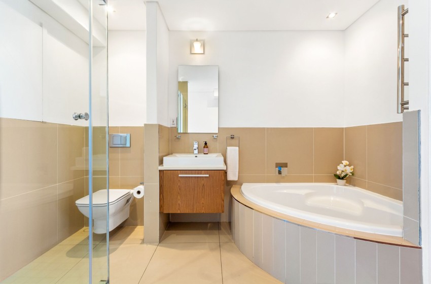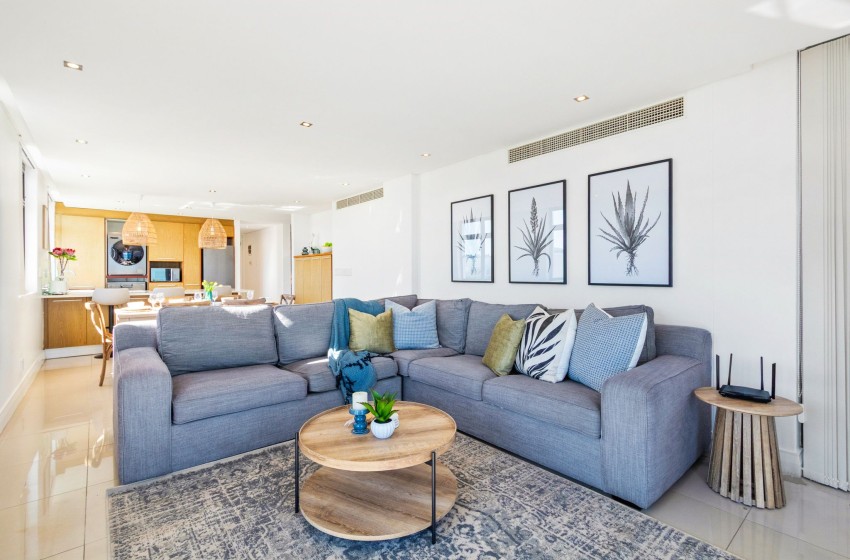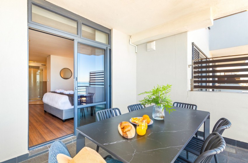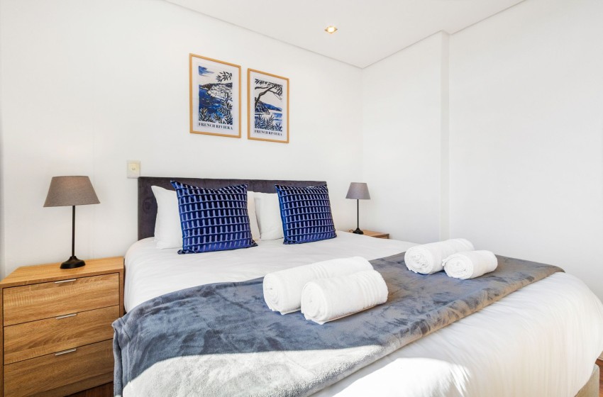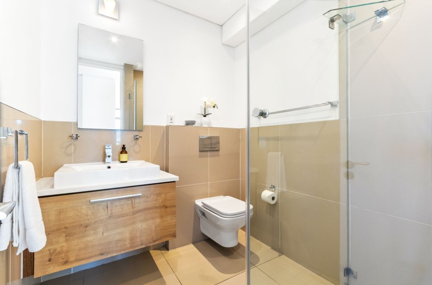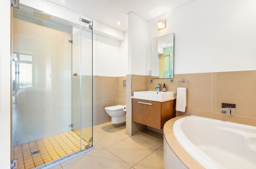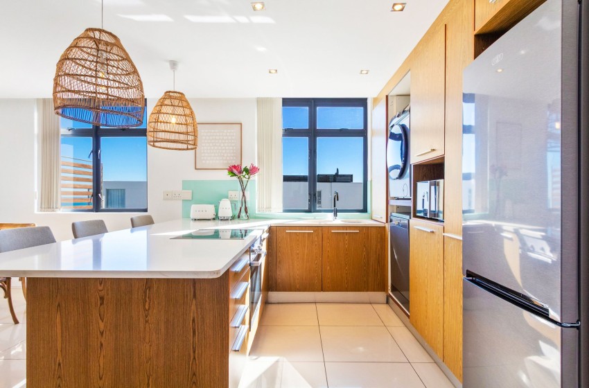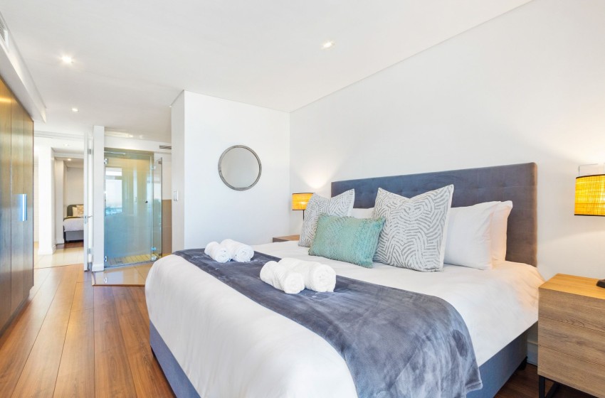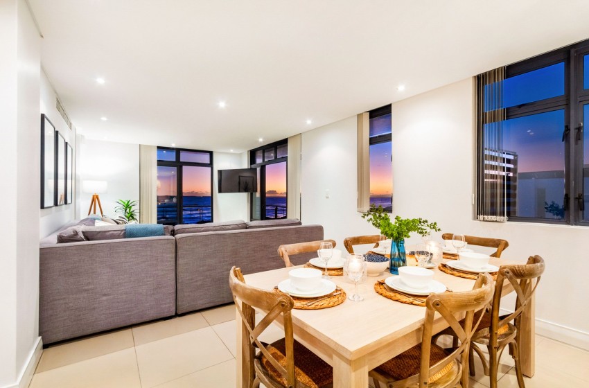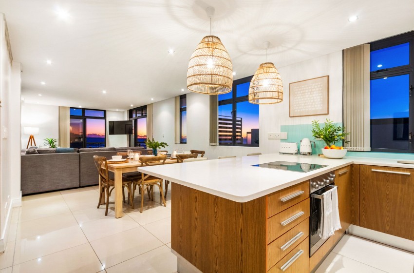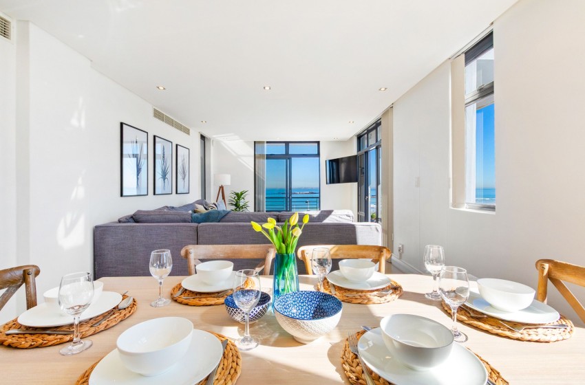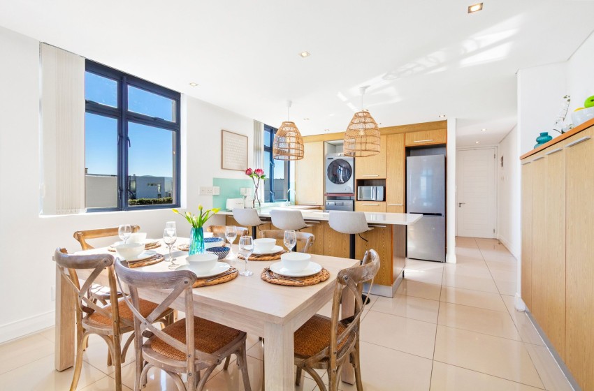In addition to the exquisite interiors, the property boasts a spacious balcony with breathtaking views of the sea, Table Mountain, and Robben Island. The family-friendly environment is enhanced by the Eden on the Bay Mall, which features a sheltered jungle gym, a large grassy play area, and child-friendly dining options, creating an ideal blend of leisure and lifestyle.