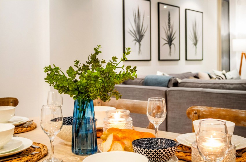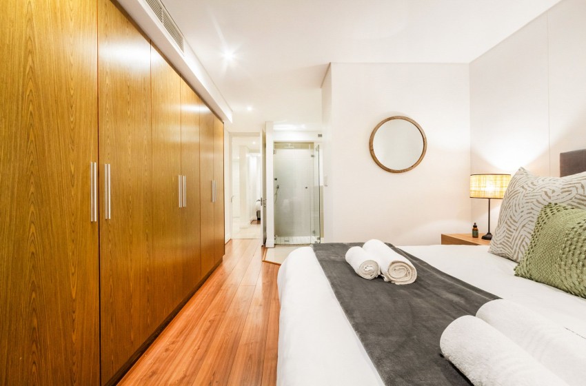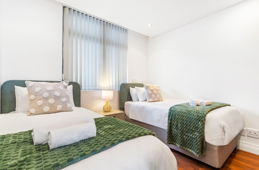 Perfect for families or groups of up to six, the apartment features three elegantly designed bedrooms. The master bedroom includes a king-size bed and a hair dryer, along with an en-suite bathroom equipped with a shower, bath, and toilet. The second bedroom offers a queen-size bed, while the third bedroom is furnished with two single beds. A shared bathroom with a shower and toilet is also available.