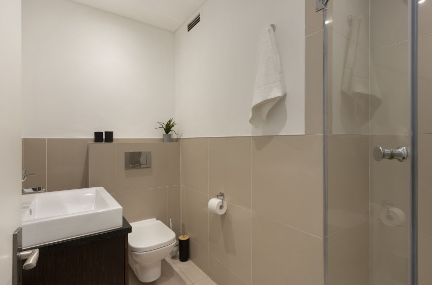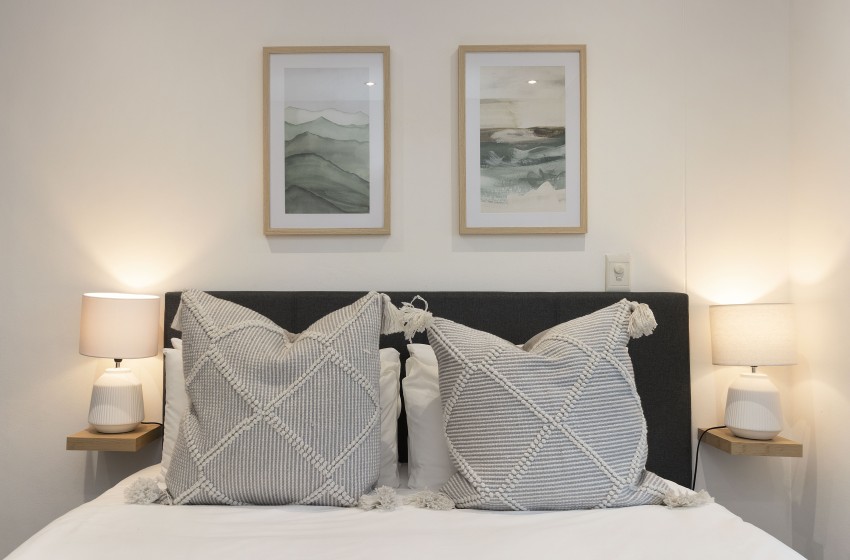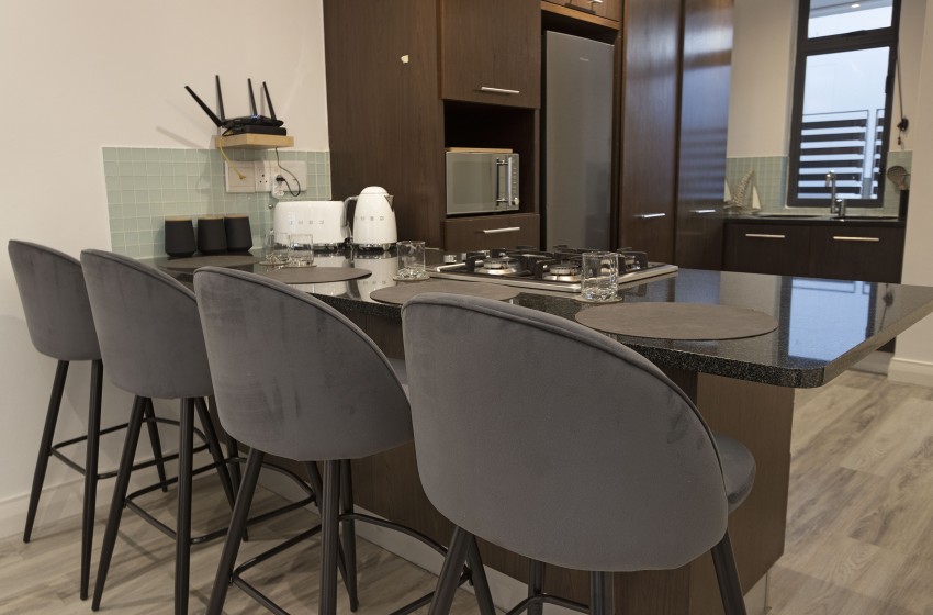 The apartment has an open plan kitchen and lounge complete with a rustic wood-like tile, a leather couch and stylish touches in soothing neutral shades. The kitchen is fully equipped for self-catering and includes a dishwasher, a washing machine and island seating for 4. The lounge features two sofas, WiFi, and an impressive flat-screen TV for relaxing nights bingeing your favourite series. A standout feature of this home is the balcony that boasts a gas braai/BBQ and a picnic bench - perfect for alfresco dining in good company. The is equipped with an inverter to enusre uniterrupted TV and internet access.