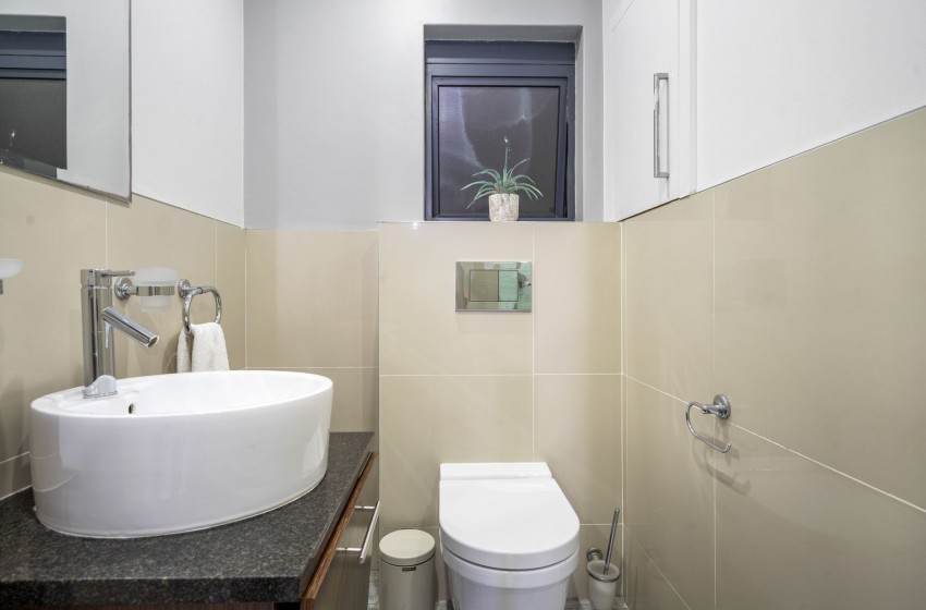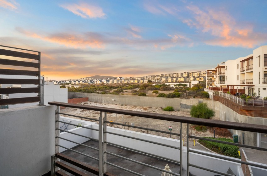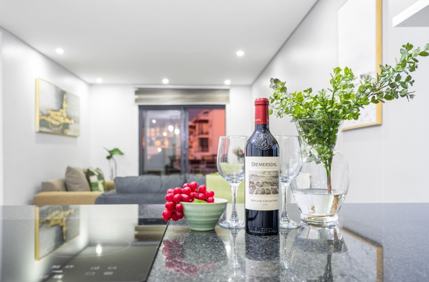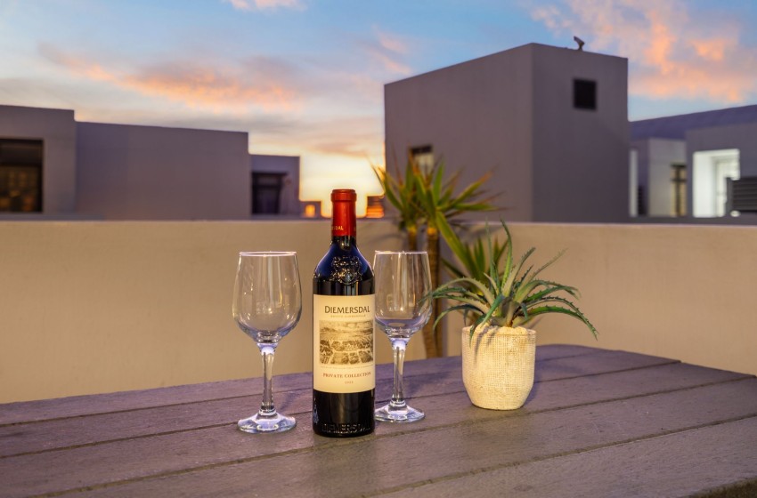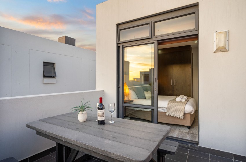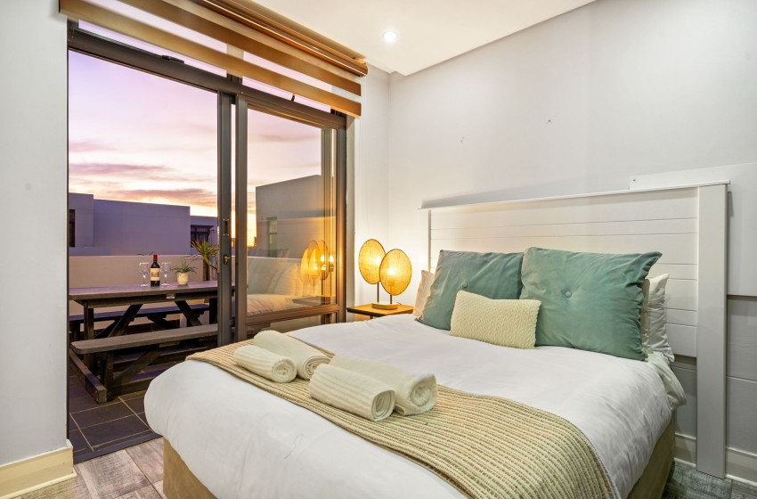 The apartment has an open plan kitchen and lounge complete with a rustic wood-like tile, a leather couch and stylish touches in soothing neutral shades. The kitchen is fully equipped for self-catering and includes a dishwasher, a washing machine and island seating for 4. The lounge features two sofas, WiFi, and an impressive flat-screen TV for relaxing nights bingeing your favourite series. A standout feature of this home is the balcony that boasts a gas braai/BBQ and a picnic bench - perfect for alfresco dining in good company. The unit has an inverter to enusre uniterrupted TV and internet access.
