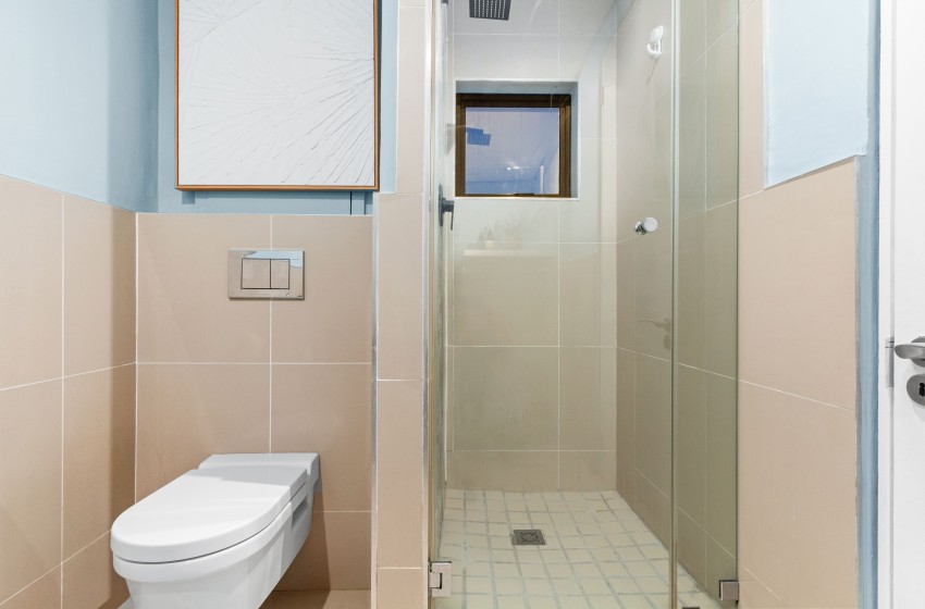 The bedroom is thoughtfully furnished with a queen-size bed with nightstands and a wardrobe, as well as a sliding door opening to a French balcony. The bathroom is fitted with a spacious walk-in shower, a washbasin with vanity and bathroom cabinet, and a toilet. Linen and towels are provided with your stay.