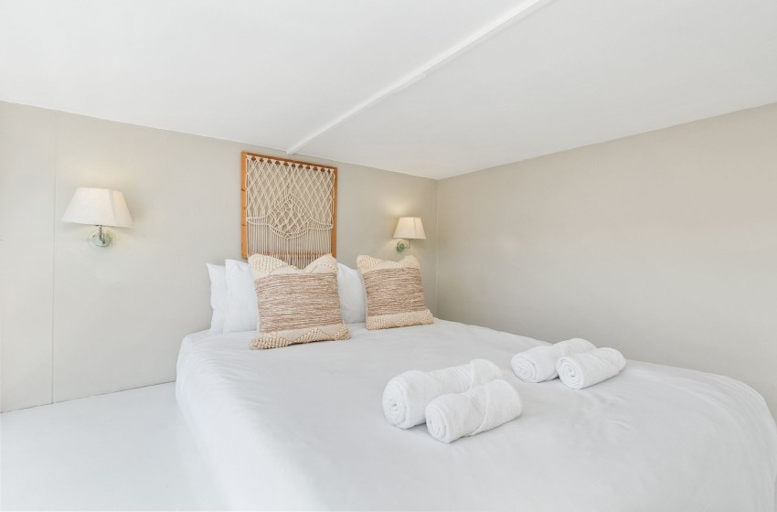 The bedroom features a double bed along with a nightstand and air conditioning. The loft is primarily a decorative feature but may also be used as an additional bedroom for up to two guests or children aged 12 and above. Please note that access is only via a ladder, making it unsuitable for young children. There is a shower, a washbasin with vanity, and a toilet in the bathroom, and fresh linen and towels are provided with your stay.