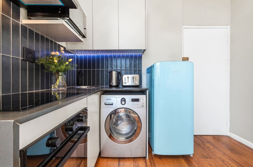 As you enter the apartment, you will be greeted by the stylish, open-plan design, featuring a fully equipped kitchen fitted with everything you need to have a comfortable self-catering experience, as well as a washing machine for added convenience.