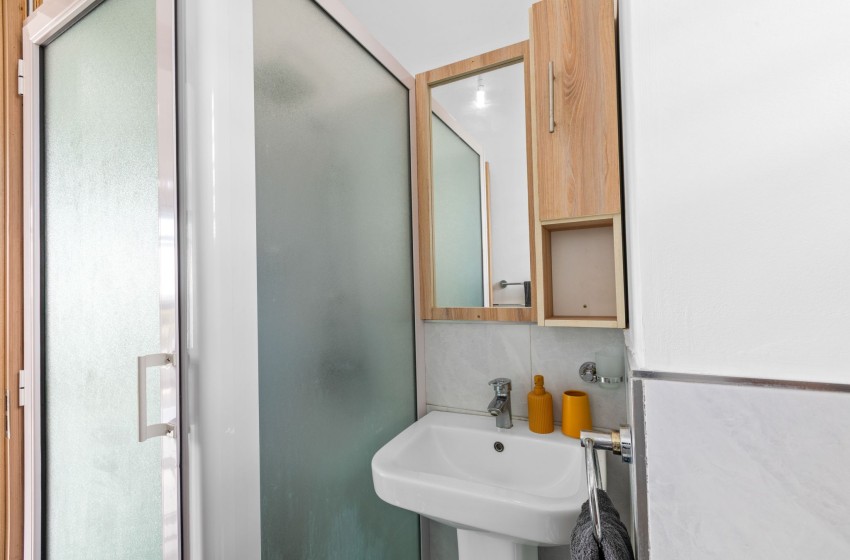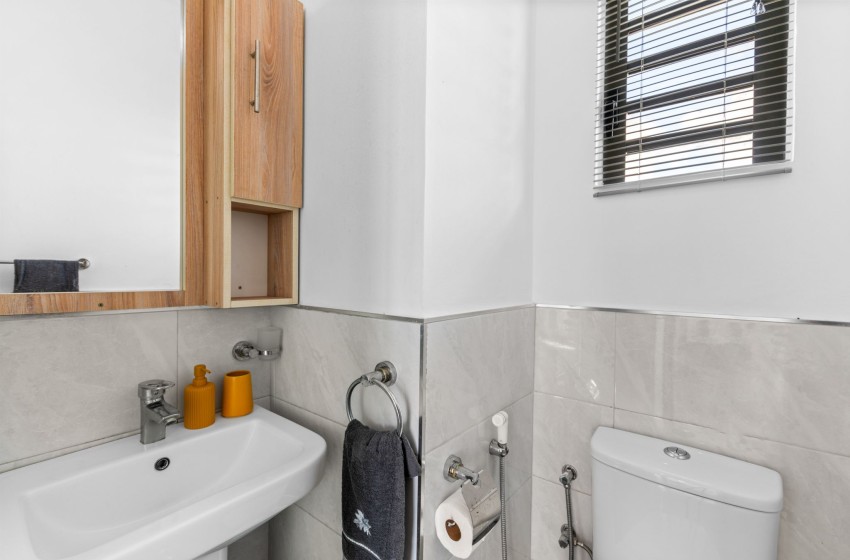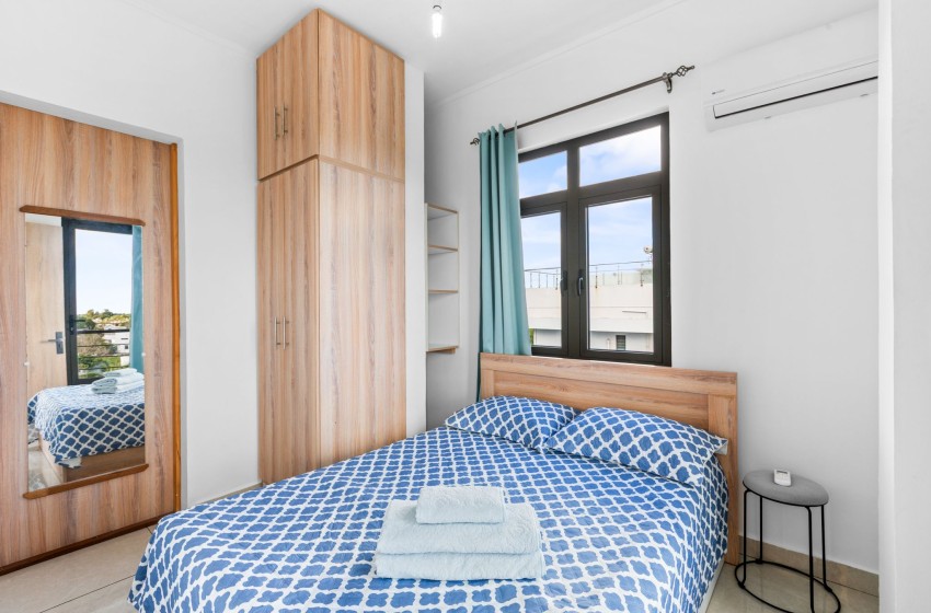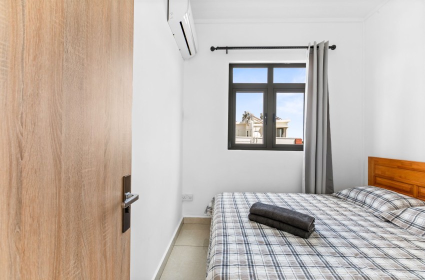 The property boasts two bedrooms, both equipped with air-conditioning. The main bedroom is fitted with a queen-size bed with plush bedding, while the second bedroom is fitted with a double bed as well as ample wardrobe space. The bathroom features a shower, a washbasin with vanity, a bathroom cabinet, and a toilet.