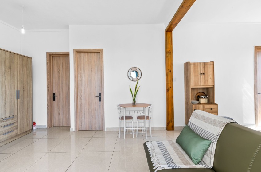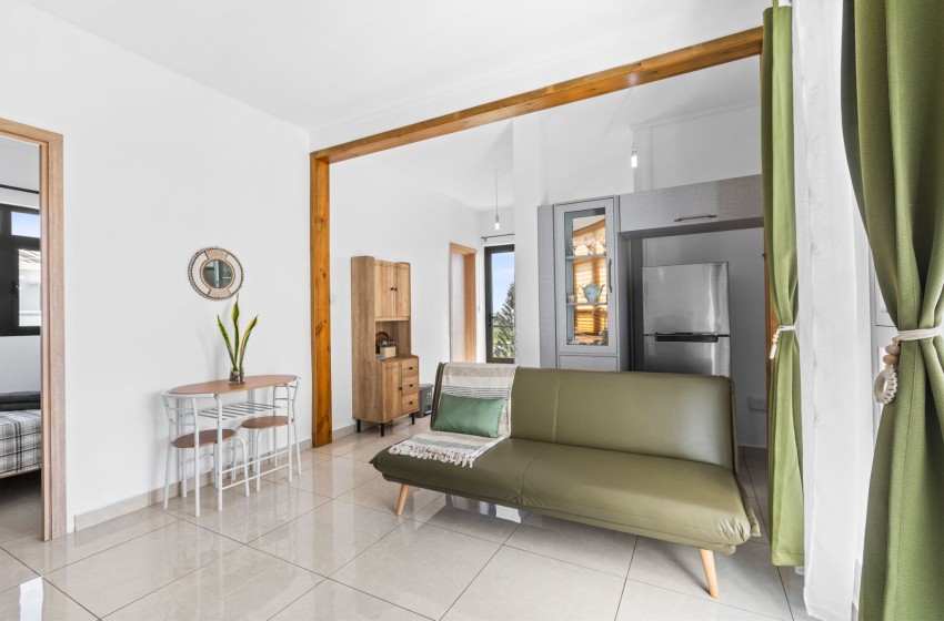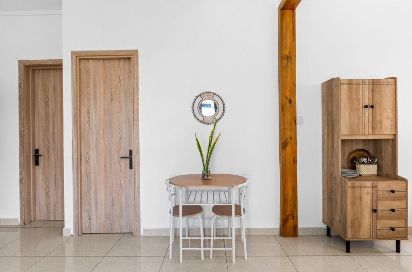 The lounge area is thoughtfully decorated with a sleek futon and single chair with a flatscreen television as well as internet access throughout the property. The dining area features an intimate dining set with seating for two and a sideboard cabinet.