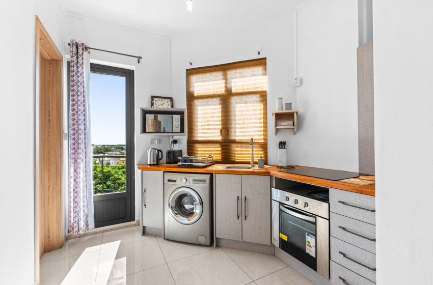 As you enter the property, a spacious open-plan design welcomes you, filled with natural light pouring in from the windows. The kitchen is fully equipped with everything you’ll need for a comfortable self-catering experience, including a washing machine for added convenience.