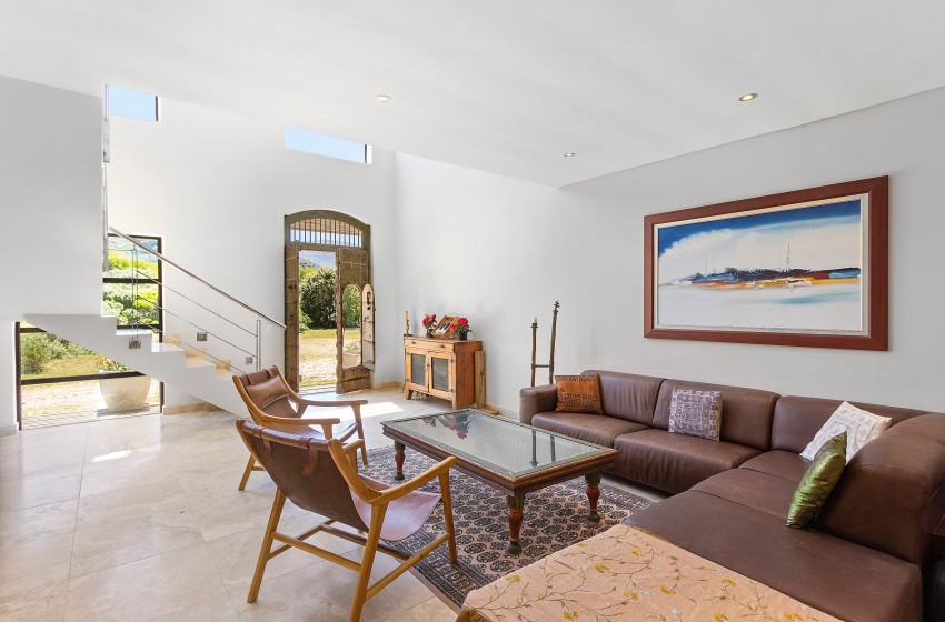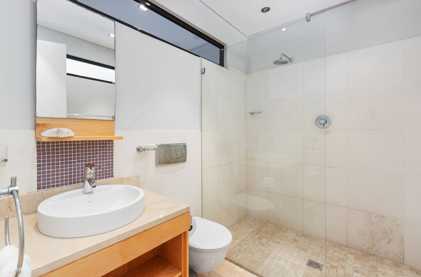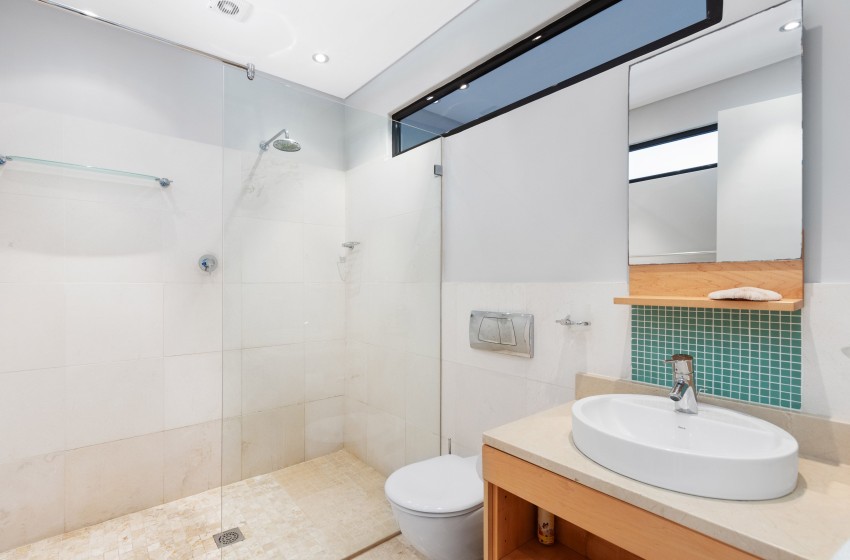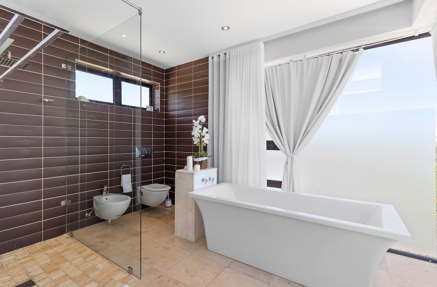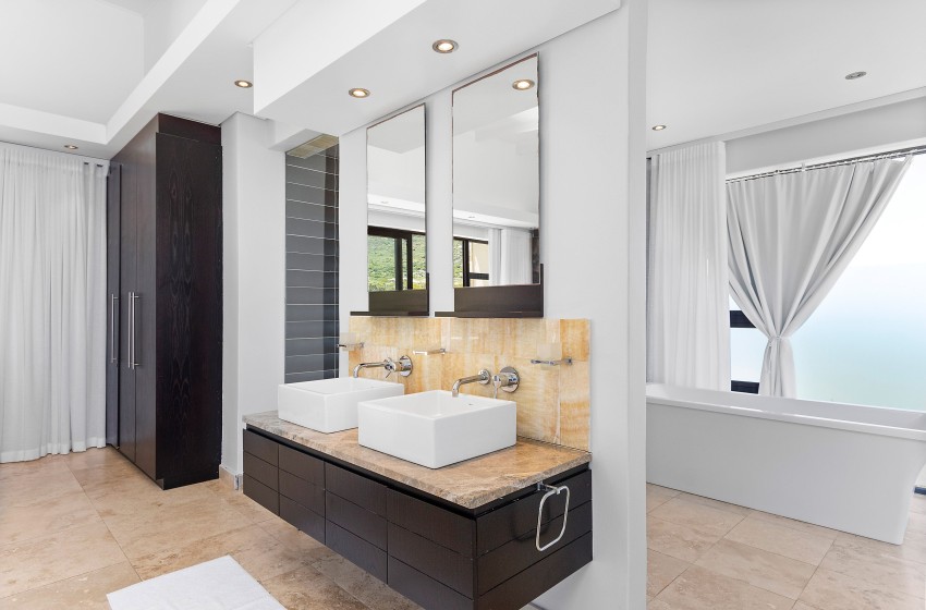 This spacious villa boasts breathtaking, spectacular views of the blue ocean, with bright waters extending as far as the eye can see under sunny and clear skies. The lounge, surrounded by windows, creates an inviting indoor-outdoor feel, allowing you to immerse yourself in the beauty of the surroundings. Modern and chic, the villa features crisp finishes, fluffy white cushions, and silky soft linen, providing an atmosphere of absolute comfort.