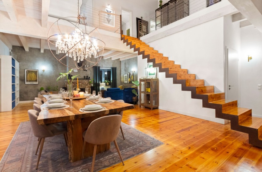 Upon entering the villa, be welcomed by its rustic charm and striking double-volume, open-plan layout. The stylish kitchen takes centre stage with a generous countertop and is fully equipped for a seamless self-catering experience including a dishwasher for effortless clean-up. The adjacent dining area features a robust wooden table that comfortably seats ten, making it ideal for shared meals and memorable gatherings. Just beyond, the beautifully curated lounge invites relaxation with its cosy furnishings, indoor fireplace, and flat-screen TV offering the perfect setting to unwind, whether you're curling up by the fire or enjoying a quiet evening in.