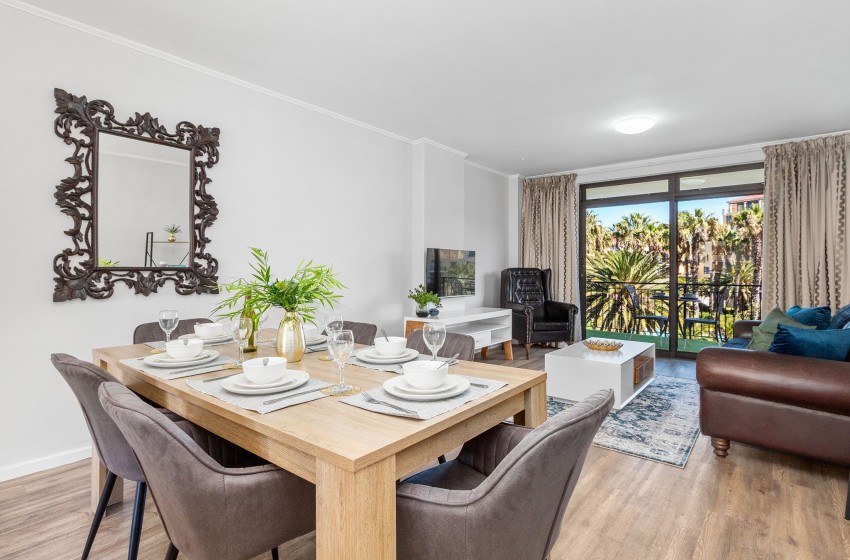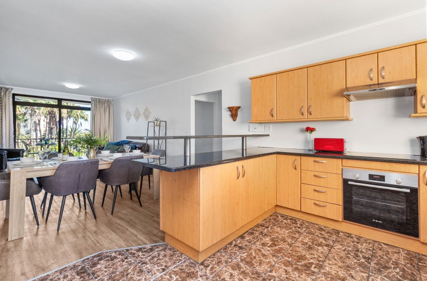 Adjacent to the kitchen, you will find the dining space thoughtfully furnished with a large wooden dining room table with comfy seating for up to six guests. The living room is furnished with a classic two-seater leather sofa, a single leather armchair, and a sleek coffee table, as well as a TV cabinet that houses a flat-screen television. Guests will enjoy internet access throughout the property. The apartment boasts a prime position in the heart of the Canal Walk precinct, with glass sliding doors opening to the balcony, with an outdoor dining set fit for two, overlooking the Grand Canal.