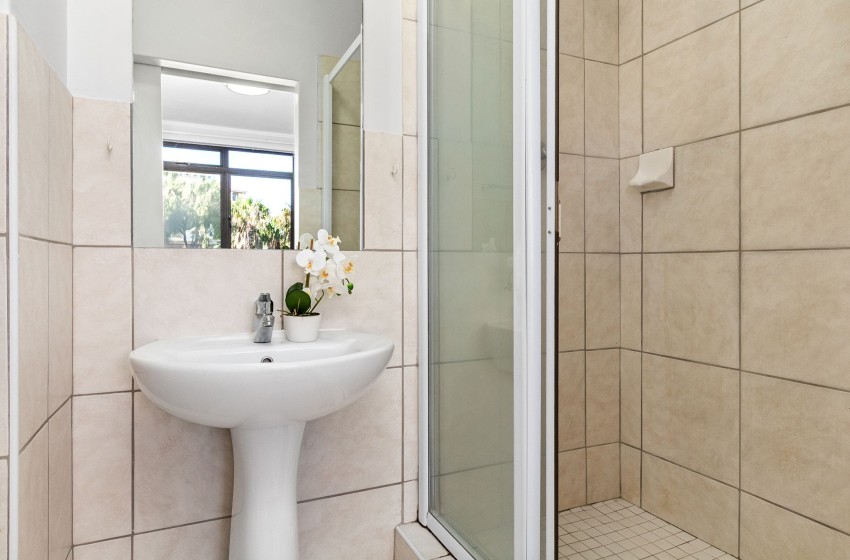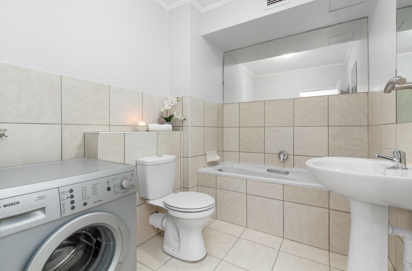 As you enter the property, you will be greeted by the spacious open-plan design of the living space. The kitchen features a large window boasting spectacular views of the city, ample countertop and cupboard space, and is fully equipped with everything you need to enjoy a comfortable self-catering experience, including a front-loading washing machine for added convenience.