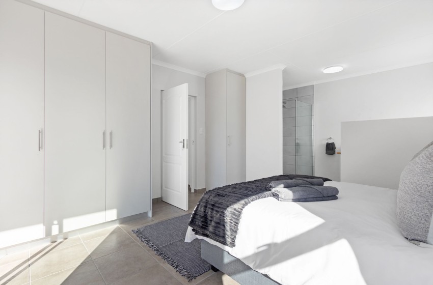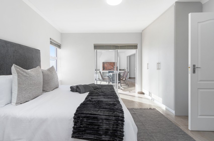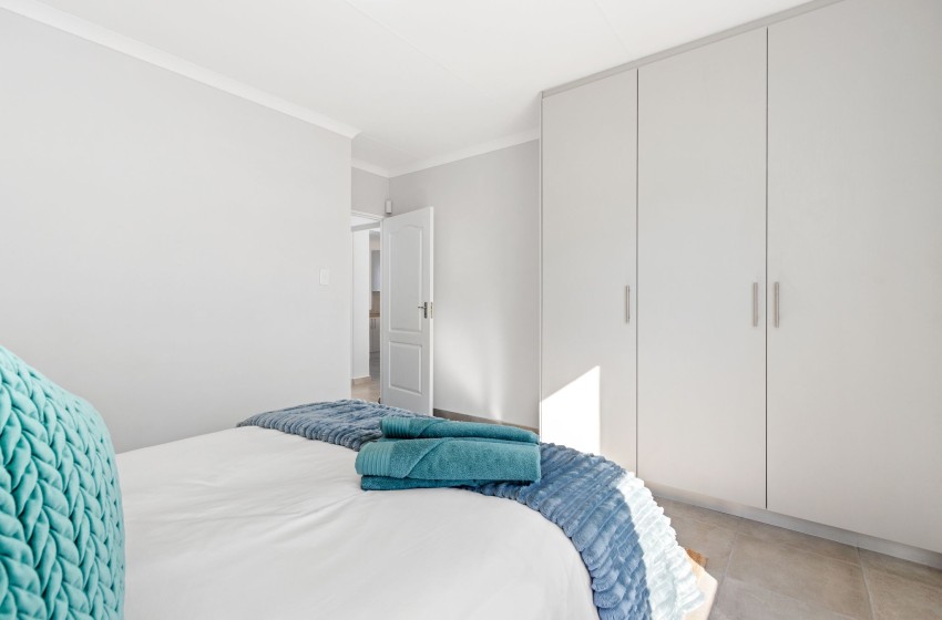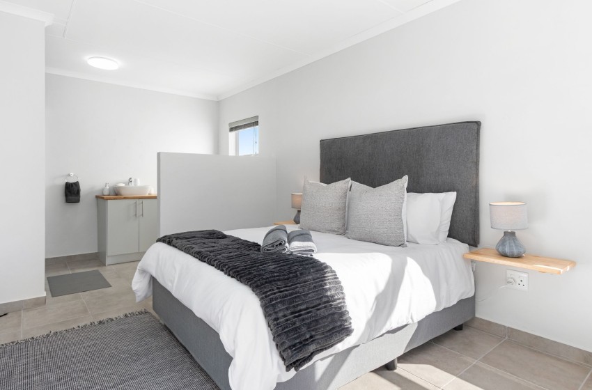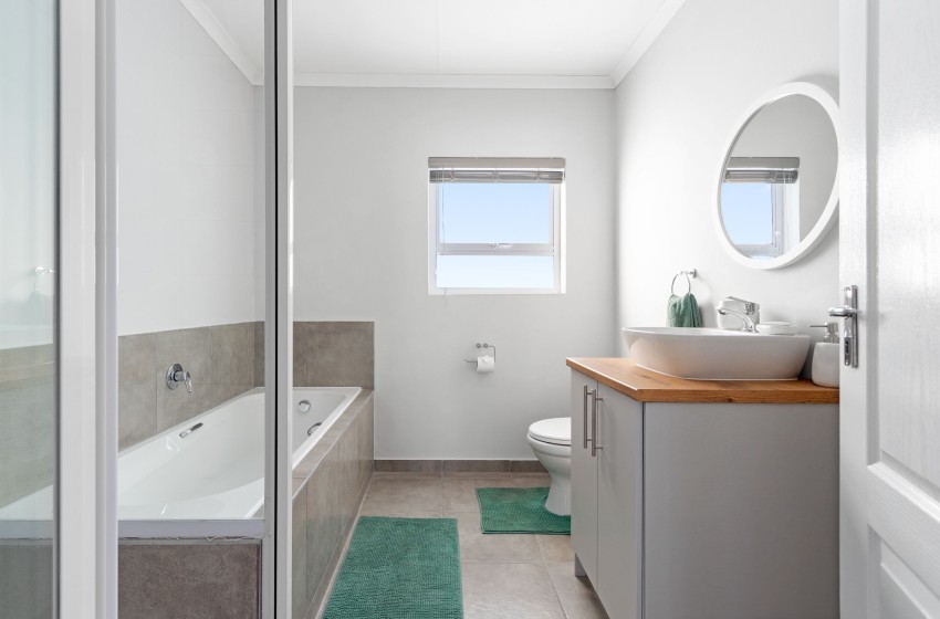 Lampiesbaai Beach House in St. Helena Bay is a beautiful seaside retreat perfect for a family or group of up to six guests. The house features three spacious bedrooms: the first bedroom has a double bed and shares a bathroom, the second bedroom has a queen bed, an ensuite bathroom with a shower, and a private patio, and the third bedroom contains two single beds and shares a bathroom. The shared bathroom includes a shower, toilet, and bath, while the ensuite bathroom in the second bedroom is equipped with a shower and toilet.