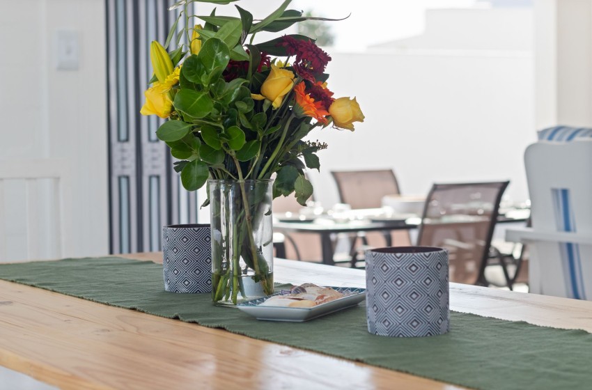 The interior of Lampiesbaai Beach House is filled with natural light, creating a bright and airy atmosphere. The décor is inspired by the ocean, with light colours, blues, and whites reflecting the seaside cottage feel. The spaces are clean and spacious, with crisp finishes and beautiful furnishings that perfectly complement the overall aesthetic.