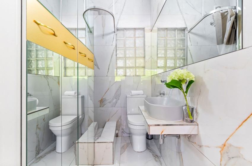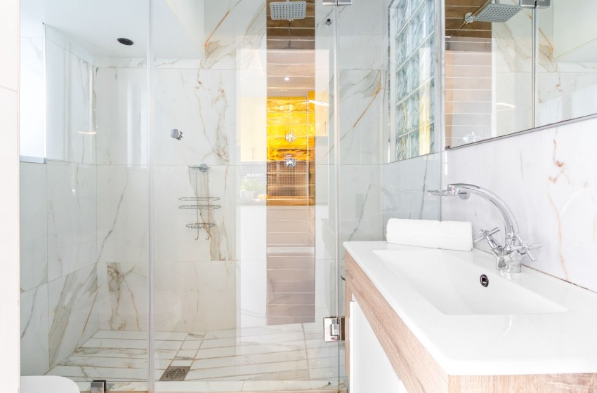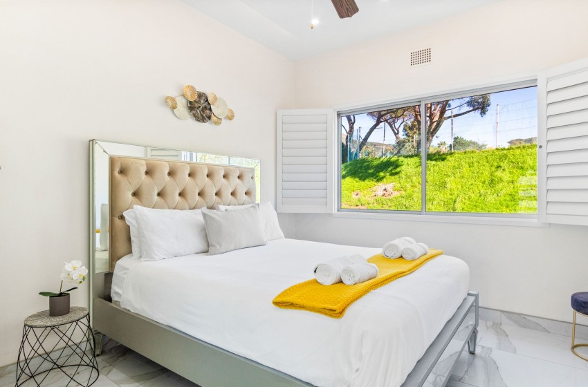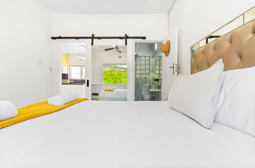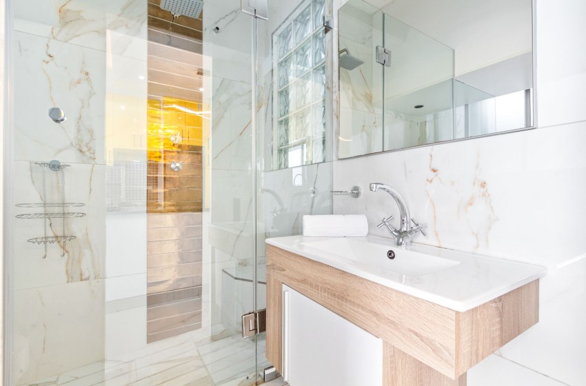 There are two bedrooms, one with an extra length king bed and the other with a queen. The master bedroom has a beautiful en-suite bathroom boasting marbled countertops and a shower, while the second bedroom has access to the shared bathroom.
