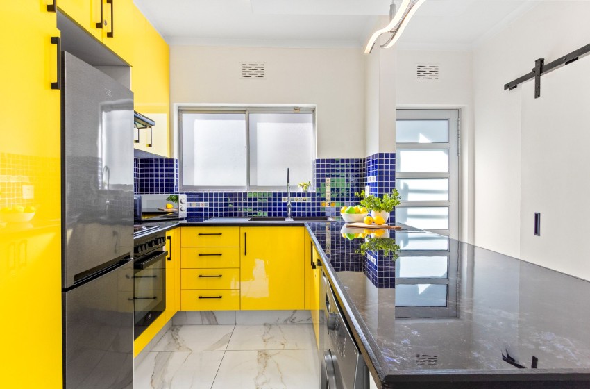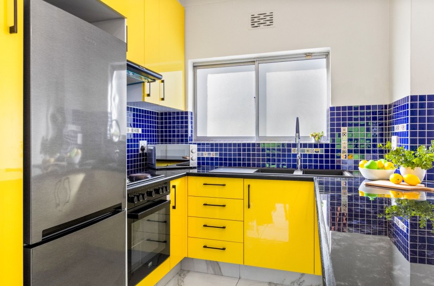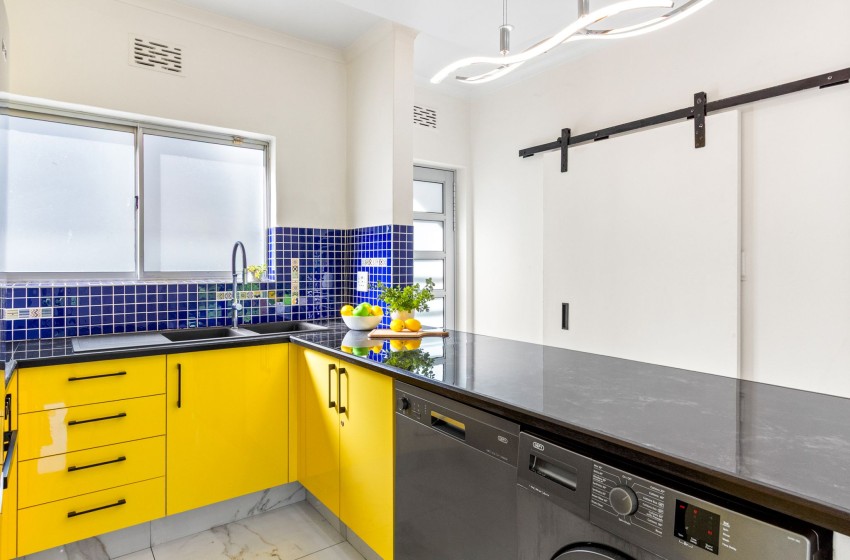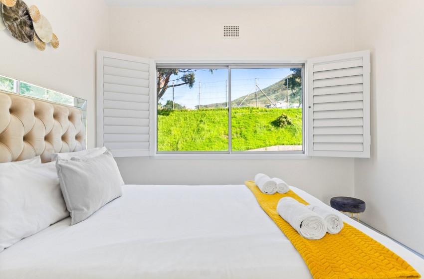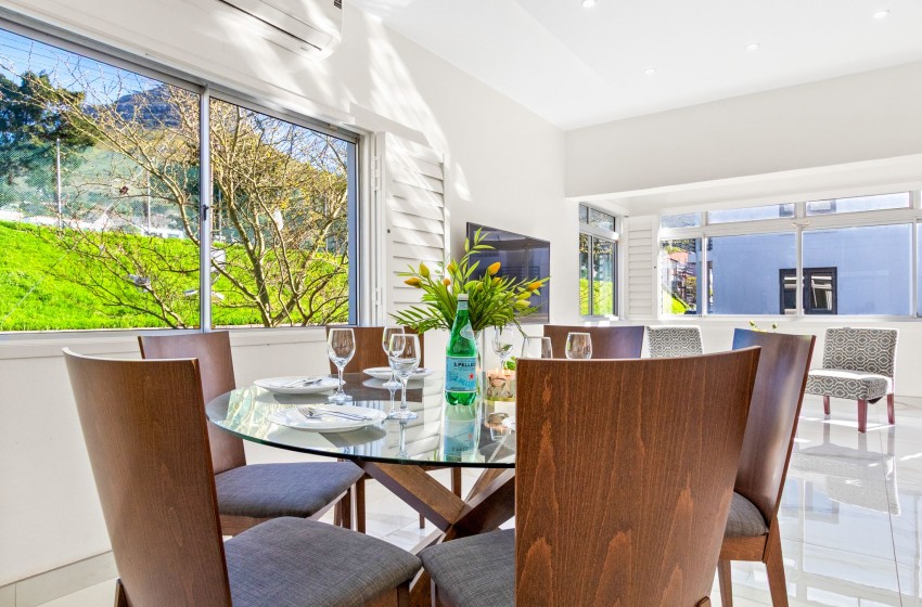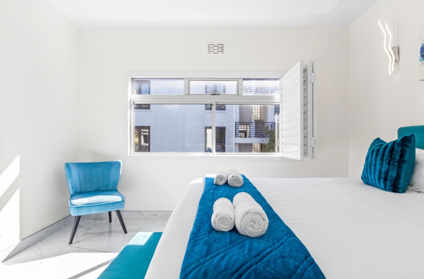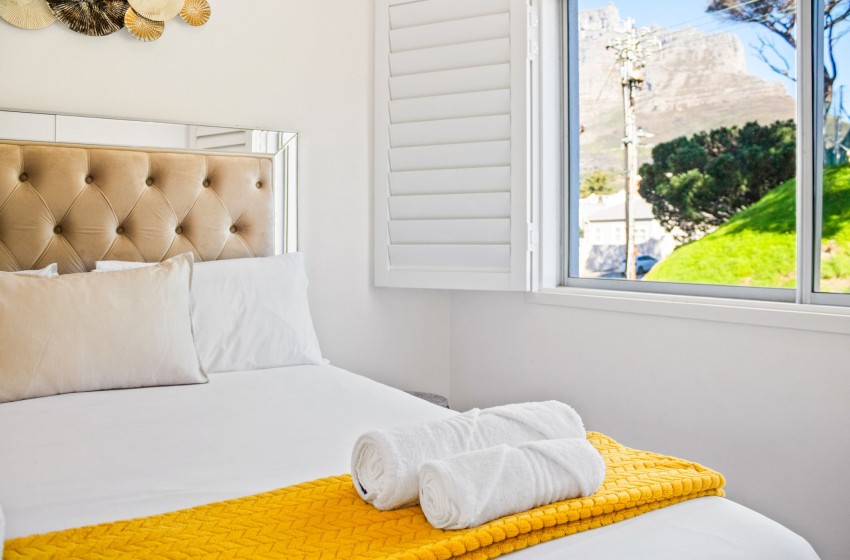 The apartment has spectacular views of Table Mountain and Lions Head and a limited view of the harbour. The apartment is fitted with an inverter to ensure uninterrupted WiFi and consists of an open plan main living area consisting of a dining area and lounge with air-conditioning to combat the summer heat. The kitchen is separate from the lounge area and features every amenity necessary to ensure effortless self-catering, including a dishwasher and washing machine for guests’ convenience. Crisp white walls, high ceilings, and ample natural light add something special to the lounge area, creating an airy and spacious environment to relax in while enjoying your favourite series on the wall-mounted flat-screen TV with Open View and Netflix.