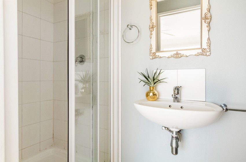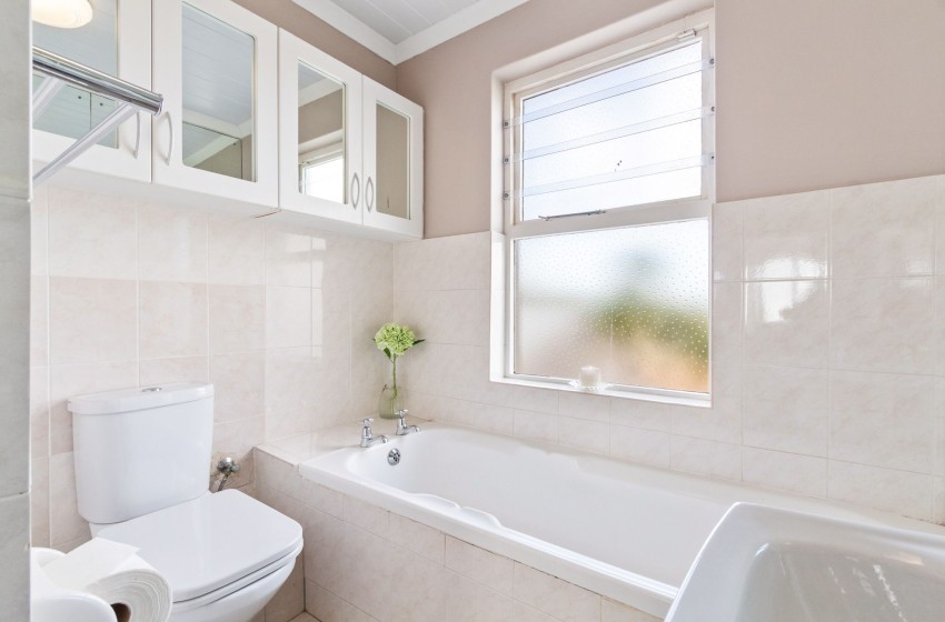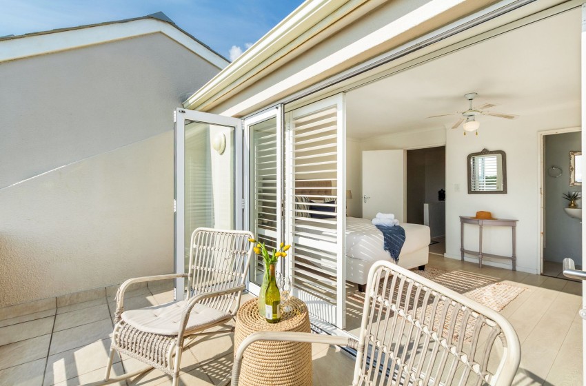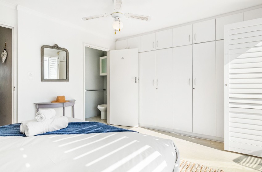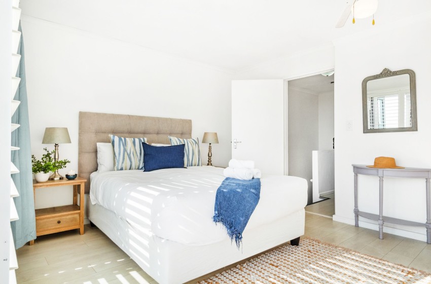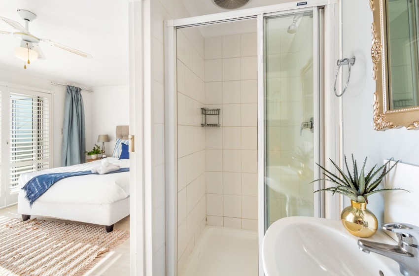 Both bedrooms are upstairs, offering privacy from the living area. The main bedroom has a queen bed, a ceiling fan, an en-suite bathroom with a shower, and balcony access with spectacular ocean views. The second bedroom has 2 single beds and a large window allowing plenty of natural light, accessing the shared bathroom featuring a bathtub and shower and the shared guest toilet.