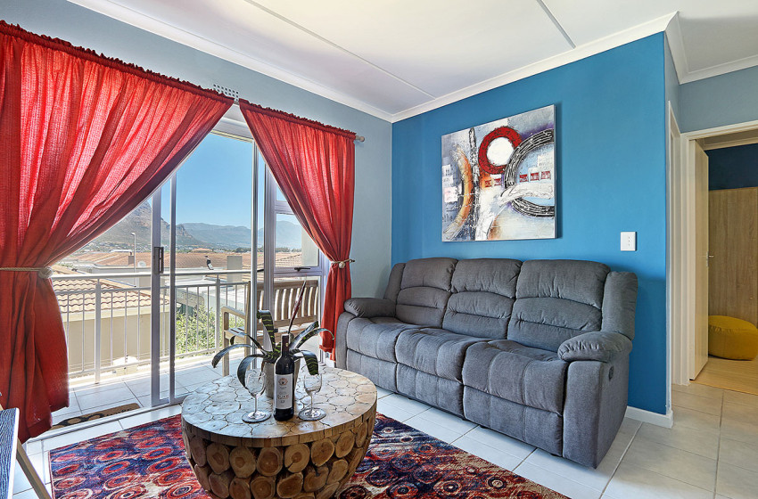 The apartment is located within a secure apartment complex and gives off spectacular views that form part of Table Mountain National Park. The main interior includes an open plan kitchen with island seating for 3 and a lounge with a flat-screen TV that is perfect for settling down to watch the sunset or enjoy an evening movie. The lounge leads to a compact balcony - the perfect place to enjoy a glass of wine with good company. The main bedroom has a king bed, and the second has 2 single beds - both accessing the shared bathroom with a shower/bath combo.