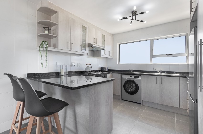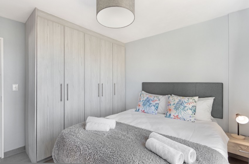 This self-catering apartment has everything you will need for an unforgettable stay. This modern apartment, with its fully furnished kitchen, cosy open-plan living room with a TV, and everything else you could possibly need for a self-catering stay, is the ideal place to unwind after a hard day. To make your stay memorable and comfortable, the two bedrooms are furnished with a queen-sized and double bed, built-in cabinets, towels, and linens, as well as two modern bathrooms. The first bedroom and living area opens up to a lovely balcony where you can sip your morning coffee while appreciating the breathtaking ocean and mountain views.