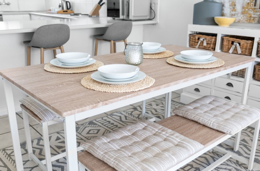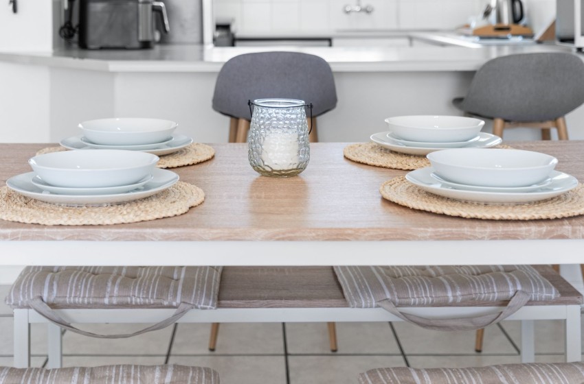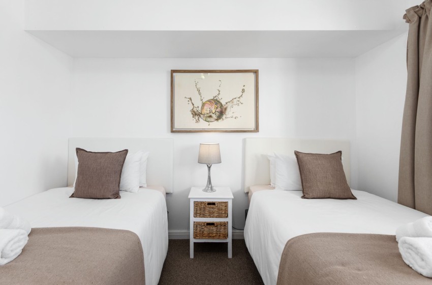 The main bedroom features a queen-sized bed and an en-suite bathroom fitted with a bath, shower, toilet, and washbasin. The second bedroom is furnished with two 3/4 beds and has access to a second bathroom with shower facilities. Additionally, there is a separate toilet for convenience. The open-plan kitchen is fully equipped with a fridge-freezer, microwave, oven, stove, airfryer, dishwasher, washing machine, cutlery, crockery, and tea-and-coffee-making facilities, seamlessly blending into the living area where a dining table, TV, and comfortable couches await.