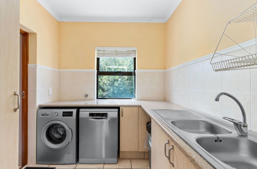 The well-appointed kitchen is equipped with modern appliances, including a fridge, microwave, oven, kettle, washing machine, stove, toaster, and dishwasher. A portable weber braai is also available on the outdoor patio, allowing guests to gather around and stay connected during their stay.