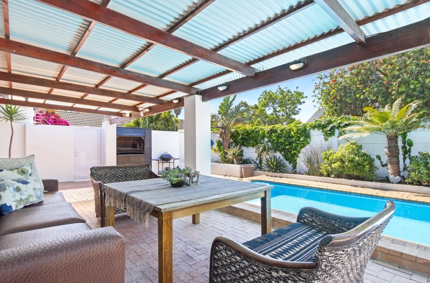 Guests will appreciate the amenities, which include internet access, Parking, including a garage with tandem parking for two cars and a cosy dining area. The lounge is perfect for relaxation, featuring a television for your entertainment needs. Featuring a bar area with a bar fridge. Step outside to discover a private garden and an inviting outdoor solar heated pool, perfect for enjoying sunny days. There’s a lovely braai/barbecue area. With towels and linen provided, you can settle in, knowing your comfort is a priority.