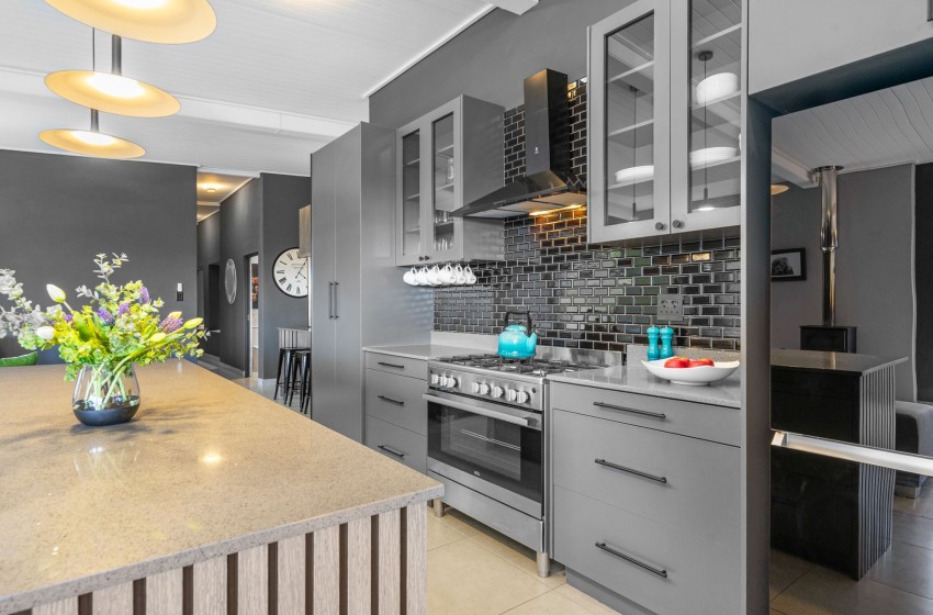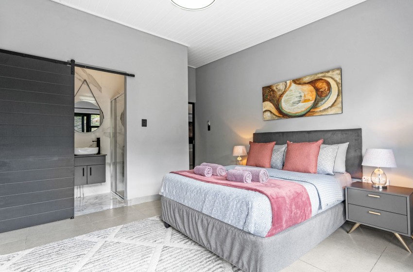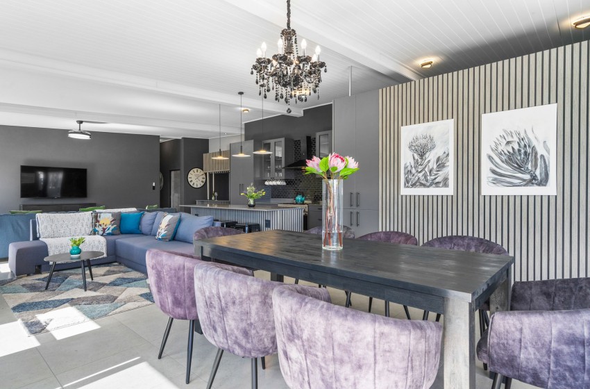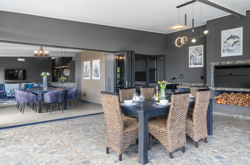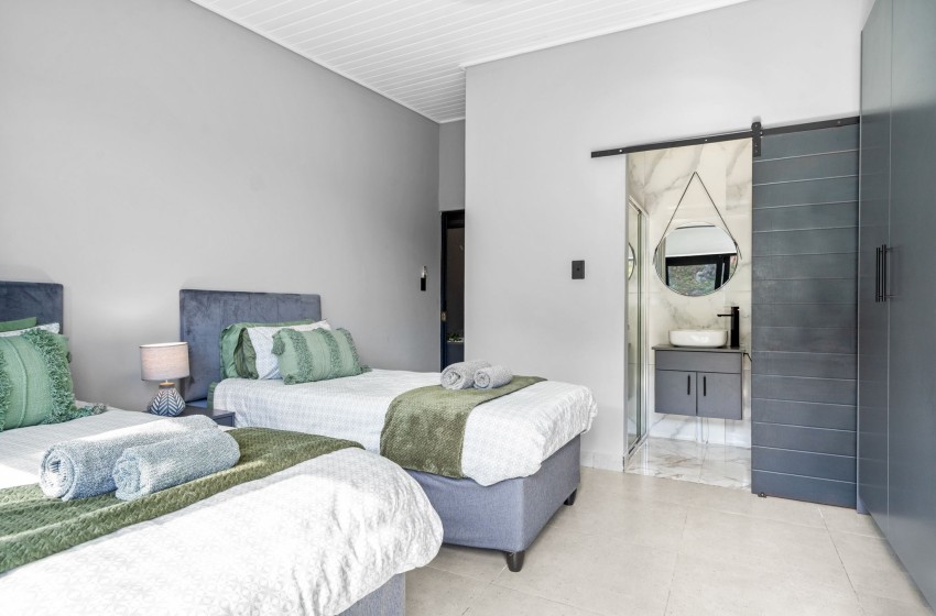 The entire property is seamlessly modern in every aspect and is guaranteed to provide a tranquil guest experience. The open-plan kitchen is fully equipped for all your culinary needs and includes a gas stove as well as a separate island counter space with seating, ensuring a comfortable self-catering stay. On one side of the kitchen guests can enjoy a built in bar area with seating along the counter while on the other side of the kitchen, you will find a scullery area equipped with a large sink, washing machine, dishwasher, and air fryer for your convenience.