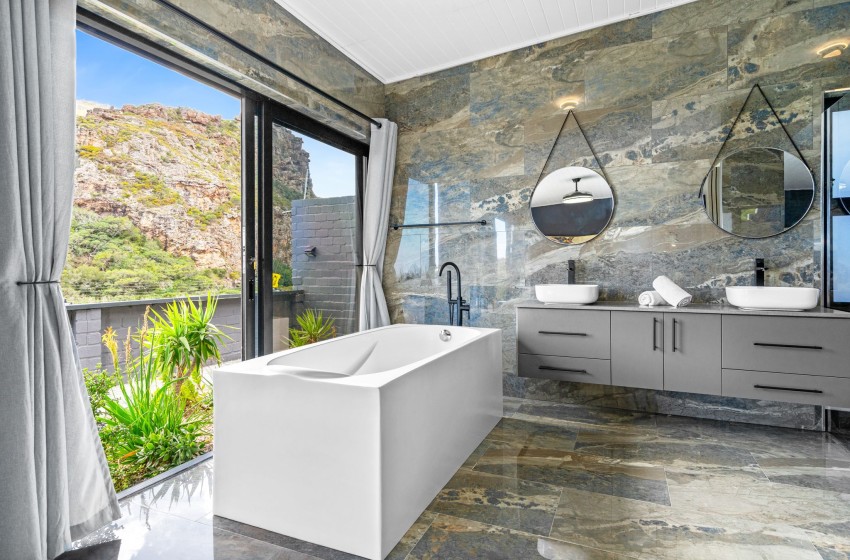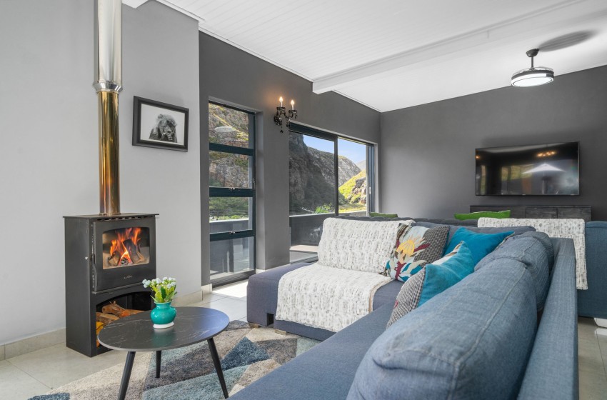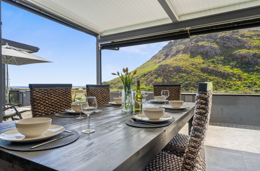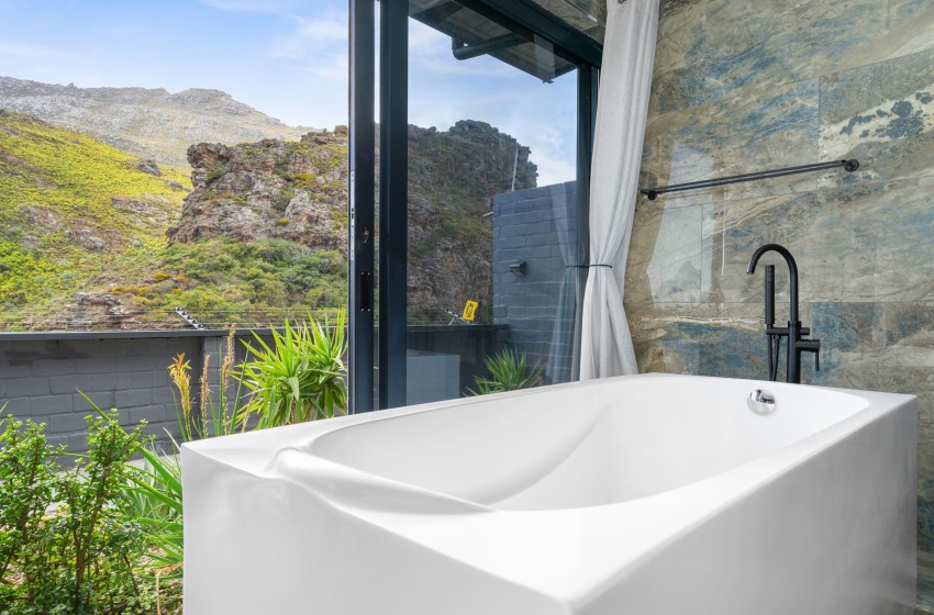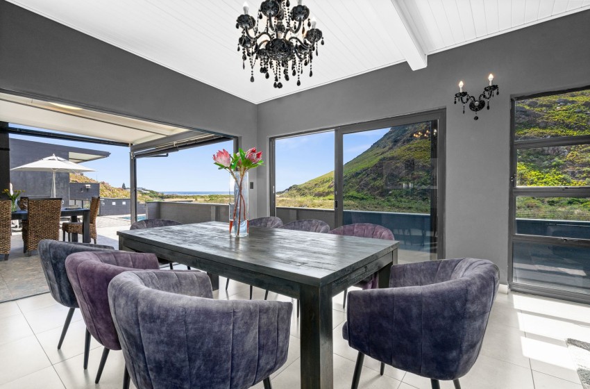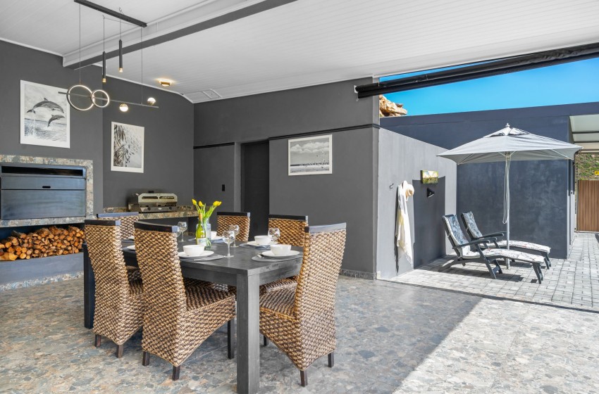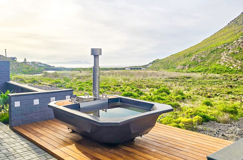 There are two dining areas to enjoy, one that seats 8 guests indoors and another that seats 6 in a covered outdoor space with braai facilities. From the outdoor dining area, guests can relax on loungers, soak up the sun, and take in the magnificent views. Adding to the charm, the property boasts a wooden deck with a wood-fired hot tub, offering the perfect spot to unwind in style. The entire property boasts sliding doors off each space in the house, including all three bedrooms allowing access to the outside space and showing off the spectacular mountain and ocean views providing pure tranquillity. Internet access is also available throughout the property.